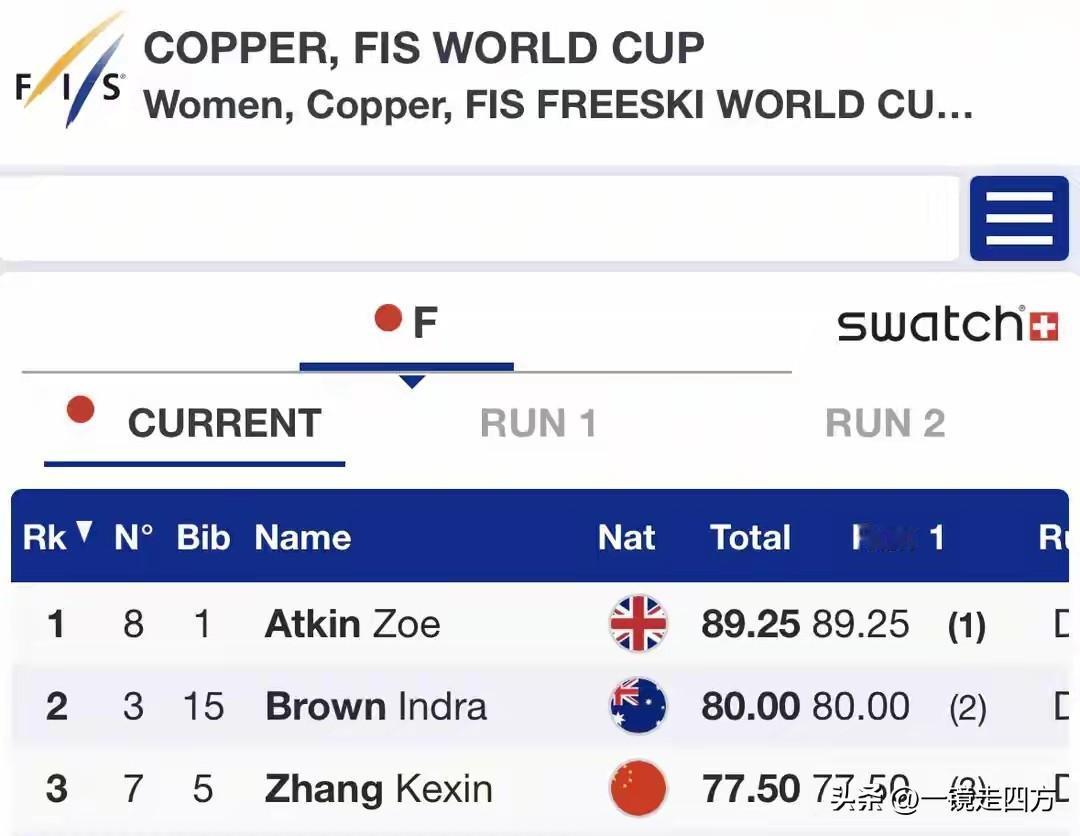 国际滑雪联合会型世界杯美国铜山站女子自由式滑雪U型池比赛,中国选手张可欣凭借第一轮的77.5分获得一枚铜牌,英国选手佐伊·阿特金凭借首轮拿到的89.25分的全场最高分锁定金牌,另一位中国选手刘奕杉在第二轮得到75.00分,名列第四,谷爱凌和李方慧未参赛。