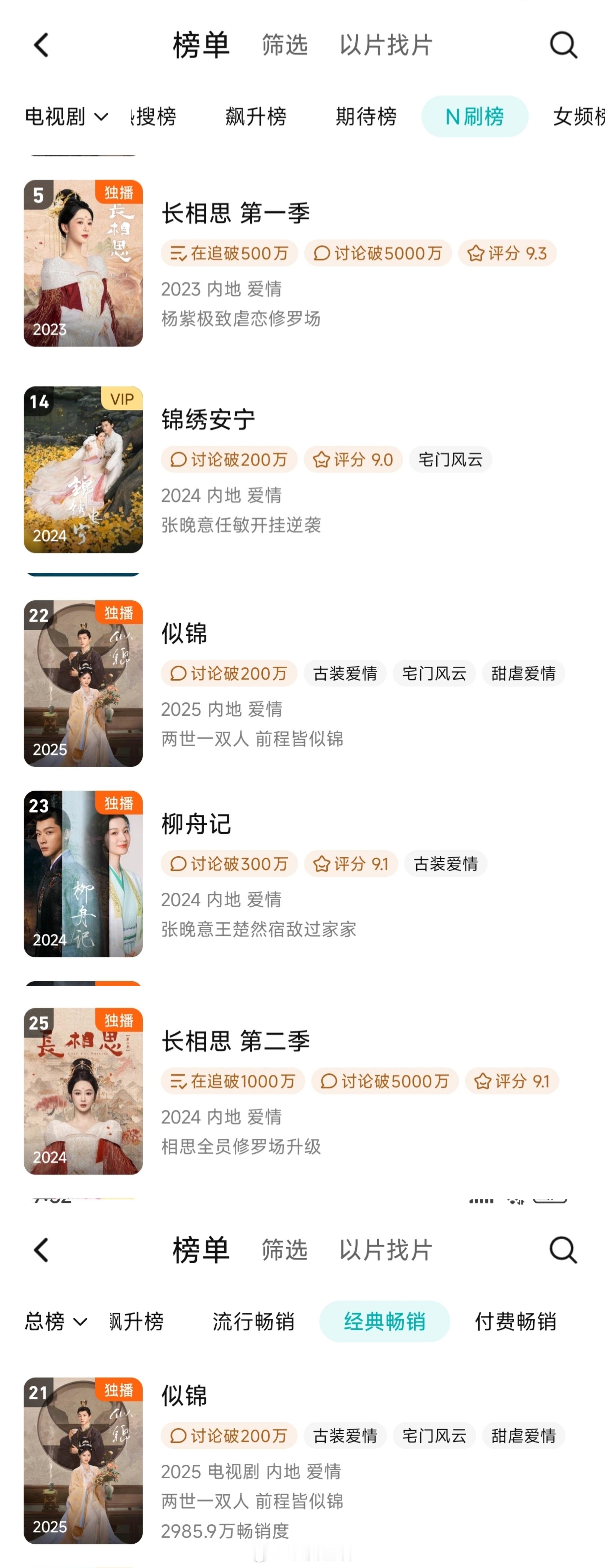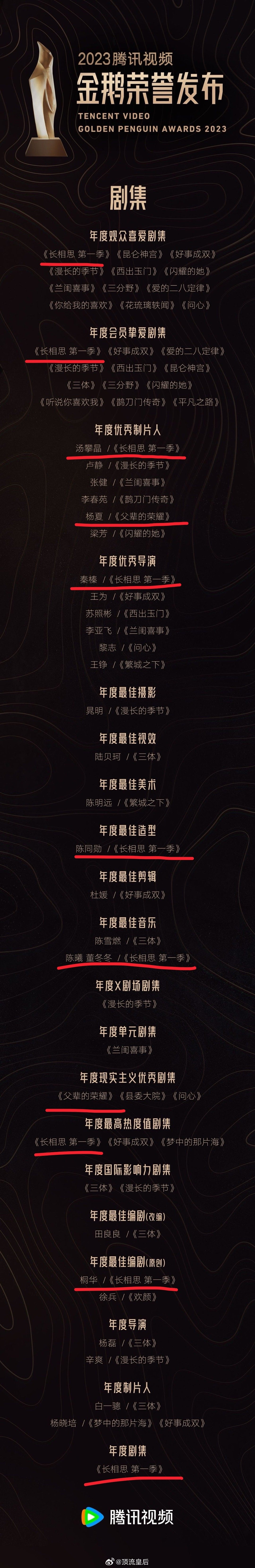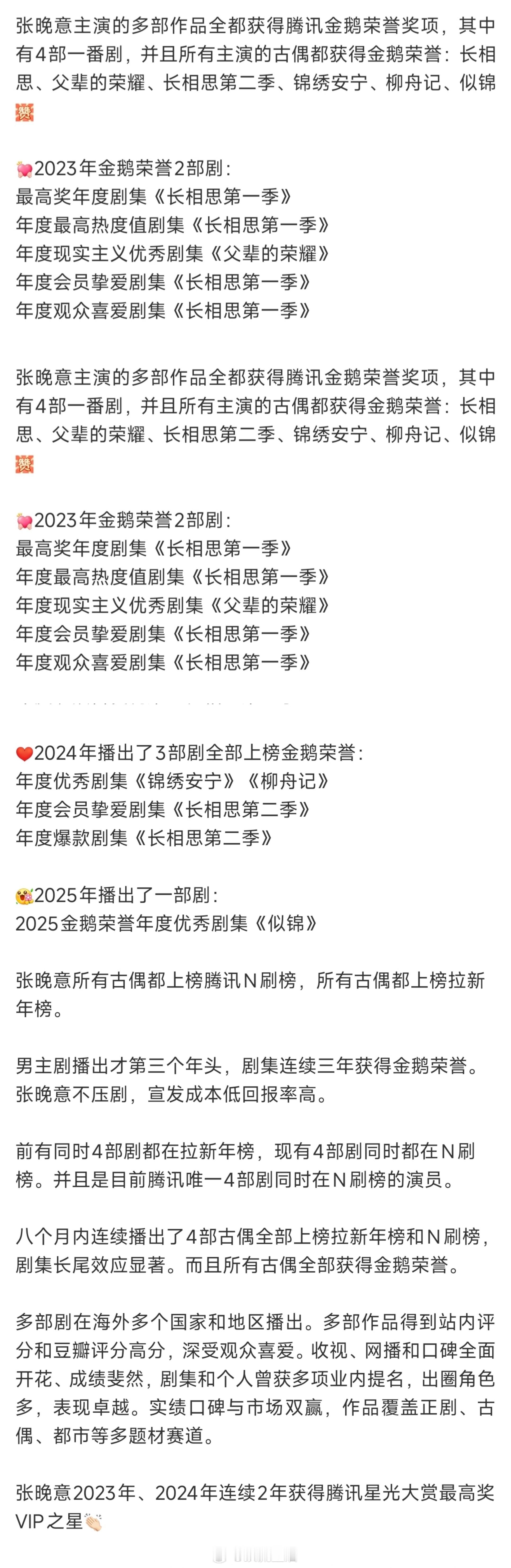张晚意主演的多部作品都获过腾讯金鹅荣誉奖项,包括《长相思》《父辈的荣耀》《长相思第二季》《锦绣安宁》《柳舟记》《似锦》。其中有4部一番剧,并且所有主演的古偶都获得金鹅荣誉张晚意所有古偶都上榜腾讯N刷榜,所有古偶都上榜拉新年榜。前有同时4部剧都在拉新年榜,现有4部剧同时都在N刷榜。并且是目前腾讯唯一4部剧同时在N刷榜的演员 张晚意2023年、2024年连续2年获得腾讯视频星光大赏最高奖VIP之星