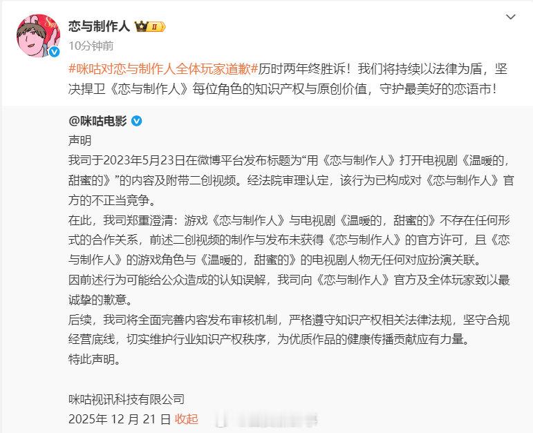 恋与制作人回应咪咕电影恋与制作人捍卫原创守护恋语市12月21日,发文向《恋与制作人》及相关玩家道歉随后,对相关致歉进行回应:咪咕对恋与制作人全体玩家道歉历时两年终胜诉!我们将持续以法律为盾,坚决捍卫《恋与制作人》每位角色的知识产权与原创价值,守护最美好的恋语市!