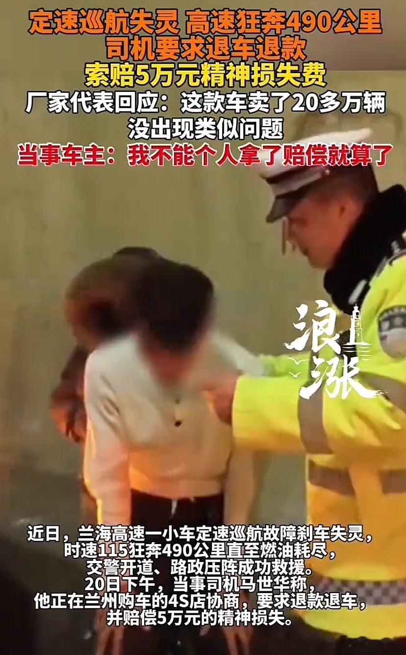 “太吓人了!”男子驾车带着朋友回老家,结果高速上发现115公里的定速巡航出现故障,刹车失灵,无法减速。男子慌了连忙报警求助,男子朋友更是直接吓哭。随后,交警开道、路政压阵,男子的车最终以115公里/小时的速度狂奔490公里,直到燃油耗尽才停下。事后,男子后怕不已,想到车子花了13万多元,才买不到1年多,要求4S店退款退车并赔偿5万元精神损失费! 据悉,12月17日下午,马先生驾车带着一名女性朋友从兰州南上高速,准备回临夏康乐老家。 途中,马先生想省事,开启定速巡航模式,将车速定在115公里/小时处。 可令马先生万万没想到的是,开了一会儿后,马先生想减速时,发现刹车失灵、无法减速。 当时马先生便慌了,而马先生的女性朋友更是直接吓哭。 随后,无奈之下马先生向警方求助。 高速交警闻讯当即联合路政部门开展紧急救援。 而在交警一路开道、路政压阵的情况下,马先生的车最终以115公里/小时的速度狂奔490公里,直到燃油耗尽才停下。 当车停下来的那一刻,马先生浑身发抖得说不出来话,还是被人扶上救援车的。 事后,劫后余生的马先生后怕不已,想到车子花了13万多元,才买不到了1年多,便要求卖给自己车的4S店给自己一个说法,即退款、退车并赔偿5万元精神损失费。 发生这样的事情,厂家也非常重视,立即派员赶到4S店,不过,马先生认为这样关乎人命安全的重大安全问题,担心厂家做手脚,要求封存事故车。 《家用汽车产品修理、更换、退货责任规定》第22条规定,在家用汽车产品三包有效期内,符合本规定更换、退货条件的,消费者凭三包凭证、购车发票等由销售者更换、退货。家用汽车产品自销售者开具购车发票之日起60日内或者行驶里程3000公里之内(以先到者为准),家用汽车产品出现转向系统失效、制动系统失效、车身开裂或燃油泄漏,消费者选择更换家用汽车产品或退货的,销售者应当负责免费更换或退货。 在家用汽车产品三包有效期内,发生下列情况之一,消费者选择更换或退货的,销售者应当负责更换或退货: (一)因严重安全性能故障累计进行了2次修理,严重安全性能故障仍未排除或者又出现新的严重安全性能故障的; (二)发动机、变速器累计更换2次后,或者发动机、变速器的同一主要零件因其质量问题,累计更换2次后,仍不能正常使用的,发动机、变速器与其主要零件更换次数不重复计算; (三)转向系统、制动系统、悬架系统、前/后桥、车身的同一主要零件因其质量问题,累计更换2次后,仍不能正常使用的; 严格按照上述法律规定来说,即便是车子本身的问题,因购买车辆的时间已经超过60日、行驶里程也已经3000公里,马先生也不能直接要求退款退车,只能先要求4S店进行维修。 但是出于息事宁人的态度,或许也担心事情闹大,影响到品牌形象,厂家在没有确定车辆问题所在的情况下,同意退款退车并赔偿马先生2万元精神损失费。 不过,由于马先生起初没有同意,经过协商,厂家将赔偿金额调整为4.5万元。不过事后也加了一个要求,即要求马先生不能向第三方透露相关内容。 对此,马先生认为不合理,表示人命关天,不能自己一个人拿赔偿就算了,希望官方或者第三方权威机构介入,查明事故原因! 据悉,该品牌车辆全系销售了100多万辆,而马先生的这款车已经销售了20多万辆。 从法律上来讲,因车辆存在缺陷导致事故,厂家、销售都要要承担赔偿责任。 而又因车辆存在缺陷直接关系到驾驶者、乘车人的生命安全和财产安全,我国对投入市场的存在缺陷的车辆采取严格的强制召回政策,并制定专门的行政规章,对确实存在缺陷的汽车产品,明确规定应当立即停止生产、销售、进口,并实施召回。 如果厂家、销售明知车辆存在缺陷,没有实施召回,还涉嫌违法面临处罚! 如果在没有实施召回的情况,仍然进行生产、销售,对消费者而言就构成欺诈,还将面临退一赔三的惩罚性赔偿责任! 因而无论是从自身还是从车主安全的角度而言,不管是官方还是第三方是否介入,厂家都不应仅局限于个案的赔偿处理,更应启动全面的质量排查,对同批次车型的相关部件进行专项检测,必要时启动召回程序,消除潜在安全隐患。 这事您怎么看?欢迎在评论区留言,与大家一起交流您的看法! ------ 关注@安律说法 案例中看人生百态,法律中寻破局之法!