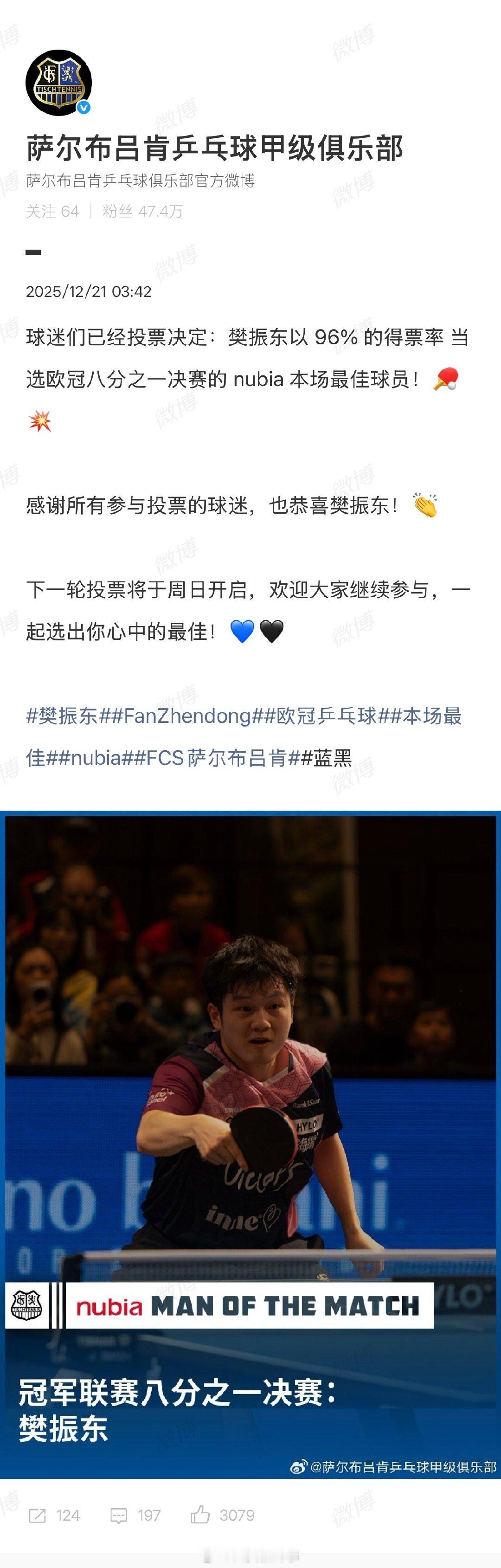 樊振东欧冠八分之一决赛全场最佳球员樊振东全场最佳96%得票率 12月21日,发文:球迷们已经投票决定:樊振东以 96% 的得票率,当选欧冠八分之一决赛的 nubia 本场最佳球员!🏓💥感谢所有参与投票的球迷,也恭喜樊振东!👏