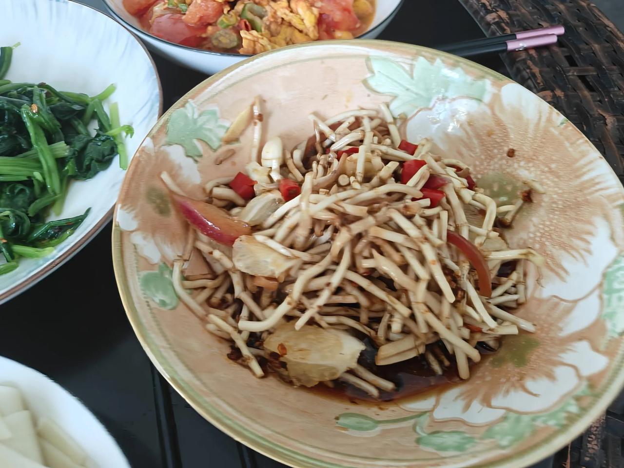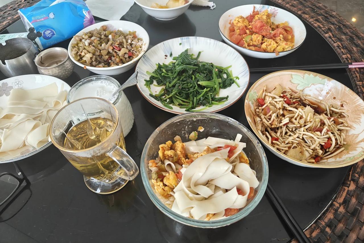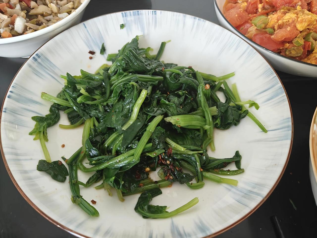 这就是我在西双版纳基本上翻过来调过去 ,吃的早上饭,谈不上早餐。我认为只有老夫少妻一起吃早上饭才可以称之为早餐。 我的早上饭属于穷饭,没有鱼没有肉,更没有穿山甲、哈士蟆甲鱼跟林蛙。 比较特别的菜就是折耳根拌柠檬丁。 从现代医学角度来看,折耳根含有的鱼腥草素等成分有一定抗菌、抗炎作用,其多糖成分有助于调节机体免疫;从中医理论来讲,它性微寒味辛,归肺、膀胱、大肠经,能清热解毒、消痈排脓、利尿通淋,可辅助改善肺热咳嗽、疮痈肿毒、湿热淋证等症状。 有句俗语说,宁吃鱼腥草,不吃头孢。 我兄弟老于,这两天上火,牙花子全肿了。 起因是他小姨子去他家浇花,把窗户都打开了,大冬天黑龙江冰天雪地,窗户敞了半个月,暖气管子冻爆了。兄弟家住高层15层。可想而知,人在西双版纳,家住黑龙江,牙花子肿是理所当然的。 我昨天给他送过去一碗我泡的折耳根,他今天早上说,肿全消了,夸我的药方如何如果好。 菠菜得吃,尤其是我们心脏备受打击的老人家,菠菜里含ω-3不饱和脂肪酸。 欧米伽3,具有辅助调节血脂,降低血液中甘油三酯水平;对心血管健康有益,能辅助维持血管弹性;还可助力大脑发育和视力保护,对婴幼儿神经系统发育、成年人认知功能有积极作用所以,菠菜必须天天吃。 西红柿炒鸡蛋 ,不一定天天吃,花茬子吃一次就好。 图片最后一个,是大侄子小峰,昨天晚上过来了,说大娘有啥吃的没有?
