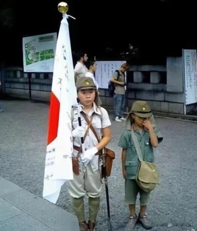 乍一看还以为是80年前拍摄的照片,仔细一看就是现在拍摄的画面,这么点的孩子,就把自己穿着打扮成这个样子,可见其从小接受的教育,依然是对军国主义的无比怀念,也可以说是在为军国主义招魂,想一想这些人长大之后会发展成啥样,这已经有了答案!