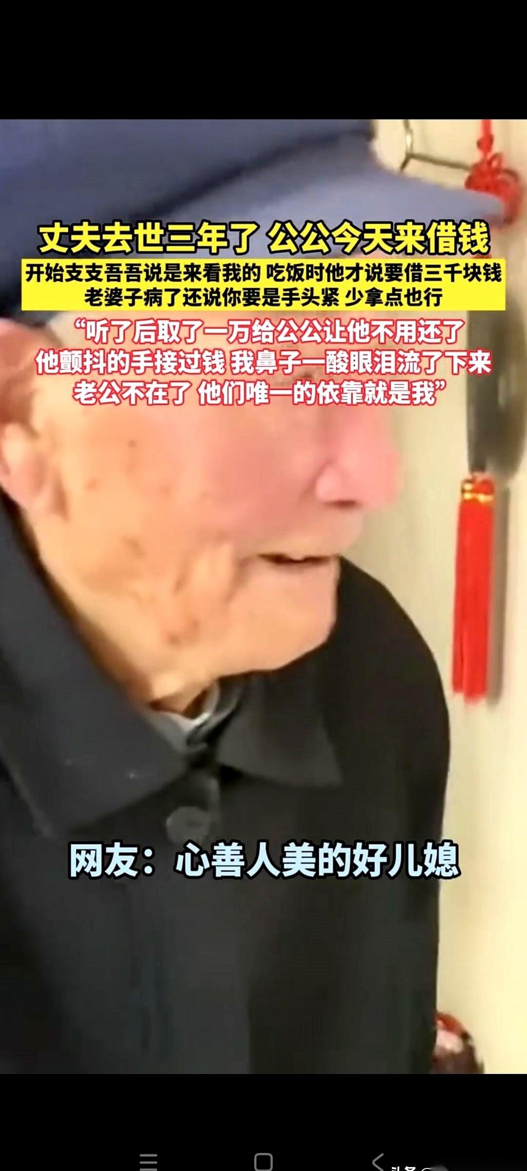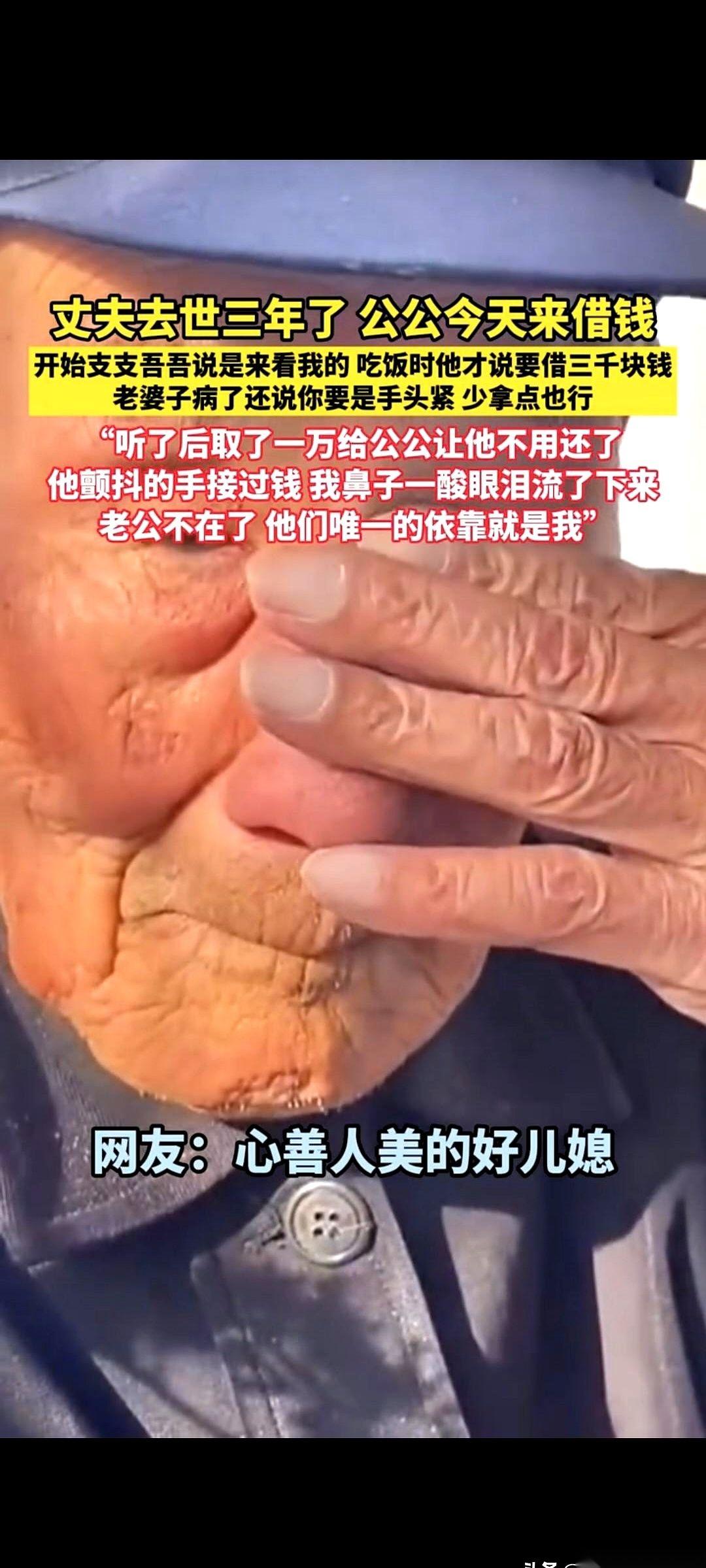 公公来借钱,张了半天嘴,说要3000。 又赶紧补了一句:你要是手头紧,少拿点也行。 就这一句话,我眼泪差点当场掉下来。 老公走了三年了。他爸今天过来,坐立不安的,只说是来看看我。吃饭的时候,才把这事儿说出口。 我当时心里就咯噔一下。 这不是钱的事儿。这是一个老人,在实在没办法的时候,把自己的尊严轻轻地、小心翼翼地递到你面前。 他怕我不给,更怕给我添麻烦。 我什么都没说,直接去取了一万块,塞他手里。 告诉他,爸,这不是借,拿着给妈看病,以后有事您就说话。 他手抖得不成样子,我赶紧扭过头,鼻子一酸。 很多人都说我善良。 其实根本不是这回事。人心都是肉长的,你敬我一尺,我还你一丈。 他但凡要是理直气壮地来要钱,觉得我欠他们家的,我可能都不会这么干脆。 可他没有。他那么卑微又那么体面地,在维护着我们之间这点所剩无几的亲情。 我老公不在了,可我还是他儿媳妇啊。 这份情,这份责任,就断不了。