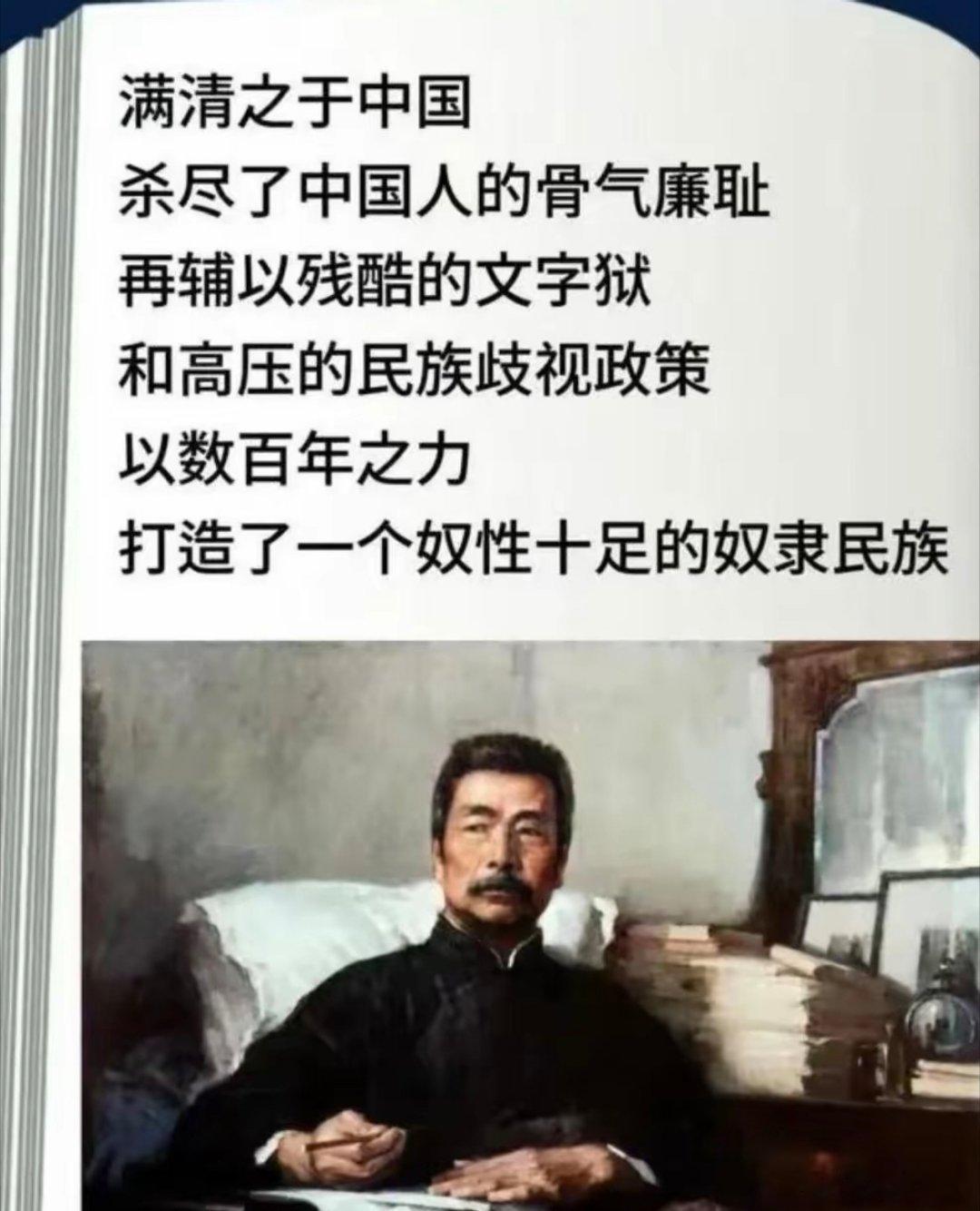 鲁迅:满清之于中国,杀尽了中国人的骨气廉耻,再辅以残酷的文字狱和高压的民族歧视政策,以数百年之力打造了一个奴性十足的奴隶民族。 鲁迅在《病后杂谈》等文中揭露清朝纂修《四库全书》时系统性地删改古书内容,以消除不利于统治的记载。他批评道:“清人纂修《四库全书》而古书亡,因为他们变乱旧式,删改原文”。鲁迅先生说:“对我最初的提醒了满汉的界限的不是书,是 辫子,是砍了我们古人的许多的头,这才种定了的,到的我们有知识的时候大家早忘了血史。”鲁迅进一步分析清朝统治策略的深远影响:“他们是深通汉文的异族的君主,以胜者的看法,来批评被征服的汉族的文化和人情,有鄙夷,但也恐惧……我们不但可以看见那策略的博大和恶辣,并且还能够明白我们怎样受异族主子的驯扰,以及遗留至今的奴性的由来的罢。” 这种批判揭示了清朝通过文化驯化导致民族精神奴化的历史后果。