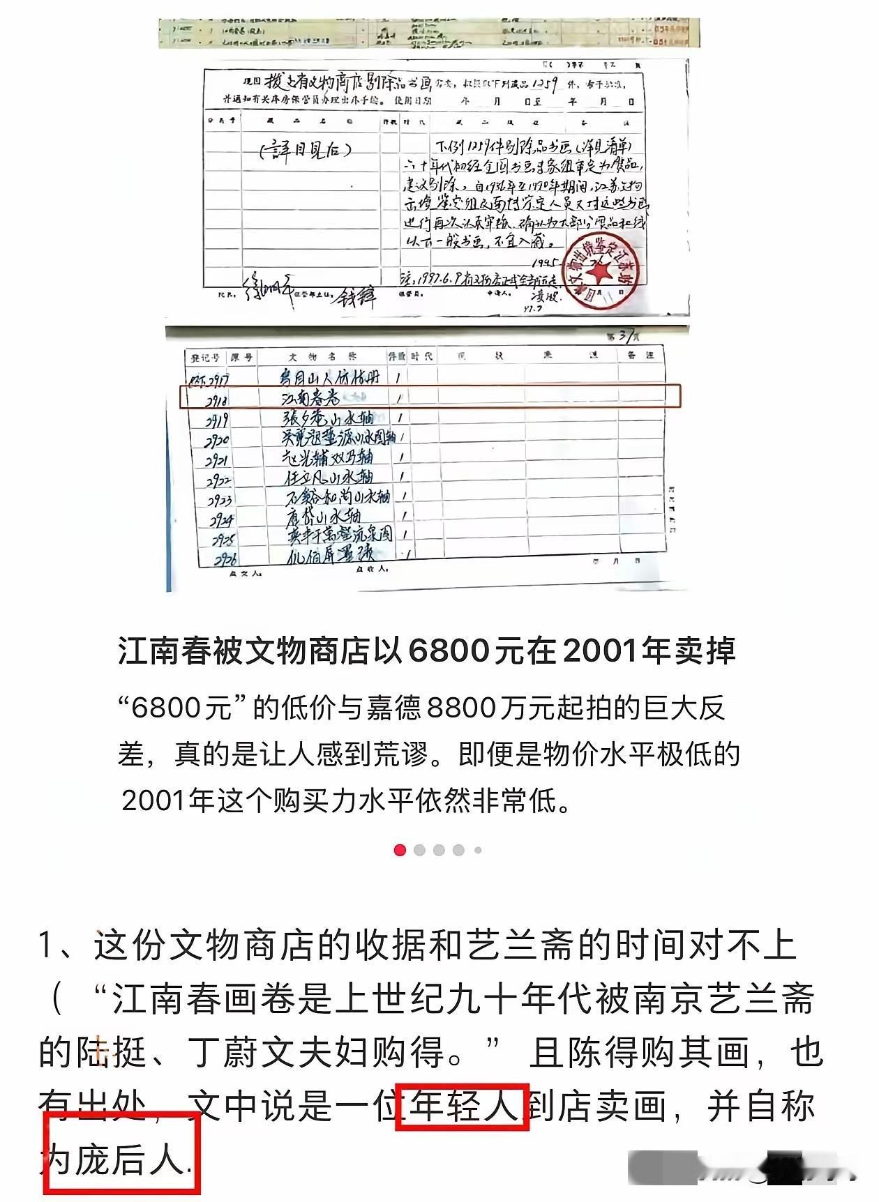 我开始有点理解庞叔令了。 这位七十多岁的老人,从没想到自己家族1959年捐赠给南京博物院的137件古画,会有5件悄然消失近三十年。直到2025年6月,她按法院调解书走进南博库房核验,才发现仇英《江南春》图卷等五幅画作不翼而飞。 更让她难以接受的是,院方声称这些是“伪作”,已按程序“剔除”并“划拨、调剂”。但提供的鉴定材料关键部分却打着马赛克,画作具体流向也成谜。这幅曾被庞家珍藏、盖有十余枚收藏印的《江南春》,今年5月惊现北京拍卖市场,估价高达8800万元。 庞家三代人守护的文化遗产,以这样的方式流入市场,搁谁心里都不好受。捐赠时满腔热忱,处置时却无声无息,这不仅是文物的流失,更是对捐赠者善意的漠视。 目前,国家文物局和江苏省文旅厅已介入调查。这场风波触及了文物捐赠制度的信任基础,希望调查结果能给出明确答案,让化私为公的义举不再蒙尘。