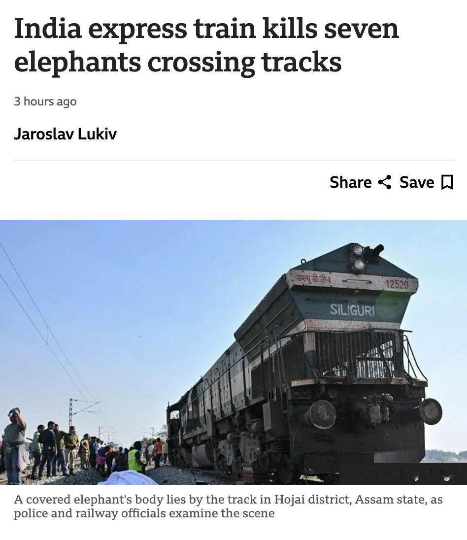 外媒:印度东北部阿萨姆邦霍贾伊地区发生一起火车撞死七头野生亚洲象的事故,包括幼崽。火车司机发现数十头大象横穿轨道后紧急刹车,但仍未能避免悲剧。 事故导致五节车厢脱轨,但乘客和工作人员无人受伤。被撞死的大象由兽医检查后被埋葬。阿萨姆邦是印度大象数量最多的地区之一,约有6000头。此次事故发生地点并非官方划定的大象通道。