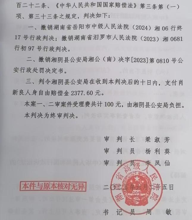 湖南男子发12字网评被行拘5日,两年三审终翻案! 2023年7月,湖南湘阴县一个普通家具店老板肖新良,怎么也没想到,自己刷抖音时随手敲下的12个字,竟会让他陷入一场长达两年的“噩梦”,也让法治的进程在纠错中迈出坚实一步。 那天,肖新良像往常一样刷着抖音,一条消防车救援视频吸引了他的注意。 视频里,有人从4楼坠落到2楼的脚手架上,消防员正在紧张救援。肖新良心里“咯噔”一下,他想起当地正在进行统一招牌改造,便在评论区敲下:“还在搞豆腐渣工程,统一招牌?”这12个字,带着他对工程质量的疑问,也带着一个普通人对公共事务的朴素关切。 可三天后,民警找上门来。肖新良以为民警是来买家具的,得知是因为那条评论,他主动提出删除。但民警没同意,还直接把他带上了车。到了医院,体检、笔录,一系列程序让肖新良懵了。 等他反应过来,已经被送进了拘留所。拘留所里,同监室的人调侃他:“一句话就把你关进来了。”但也鼓励他:“你没做错事,只管去告。” 肖新良被拘留的这5天,对妻子李莉来说,就像天塌了一样。 她四处打听丈夫的消息,电话打不通,12345也问不出结果。直到晚上收到短信,才知道丈夫要被拘留5天。 李莉一边要照顾10岁的女儿,一边要打理店铺。丈夫签下的订单信息都在手机里,她只能翻找送货单,花钱请人送货。打听丈夫情况时,她骑车摔倒受伤,手脚擦伤。女儿天真地问:“爸爸去哪里了?”她只能搪塞。等丈夫放出来,女儿还童言无忌地说:“你坐过牢嘞!”李莉心疼得直掉眼泪。 从拘留所出来后,肖新良开始了漫长的维权之路。他先提出行政复议,没得到支持。接着,他把县公安局告上法院。 2023年12月27日,汨罗市法院开庭审理,判决驳回他的诉讼请求,认为他的评论不当,破坏公共秩序,构成寻衅滋事。 肖新良不服,上诉到岳阳中院。2024年4月1日,岳阳中院维持原判。接连败诉,肖新良觉得“整个世界都是黑暗的”。但他没放弃,为了补充证据,他还特意跑到视频拍摄现场核实。 终于,转机出现了。2024年10月28日,湖南高院提审此案。 2025年6月10日,法院组织调查询问。6月25日,判决结果出来了:原一、二审判决主要证据不足,适用法律错误,应予撤销。肖新良终于洗清了冤屈,还获赔2377.60元。 这两年维权,肖新良身心俱疲。他变得沉默寡言,脾气也变差了。他整日为案件发愁,头疼得睡不着觉,还经常心绞痛,白头发也冒了出来。但他从不后悔发表那条评论,他说:“我又没说假话,我后悔什么?”不过,以后他评论时会小心一点,比如再评论“豆腐渣工程”时,就只写“豆腐”两个字,再加一串省略号。 值得一提的是,肖新良被拘时,时任湘阴县委书记李镇江,2024年1月被查,7月被双开。他存在违规营利、随意决策、权钱交易等问题。如今,岳阳市公安局、市中院已启动对肖新良一案涉及的执法司法行为的调查程序。 肖新良的经历,就像一面镜子,照见了个体面对公权力偏差时的坚韧,也折射出法治“有错必纠”的温度与分量。 它让我们看到,当个体的权利意识与制度的纠错机制同频共振,当“以事实为依据、以法律为准绳”的准则穿透行政惯性,每个普通人的“较真”都可能成为推动法治进步的微光。 守护公平正义,既需要个人的勇气,也需要制度的“兜底”与“回响”。 让我们一起为法治的进步点赞,为肖新良的坚韧喝彩!