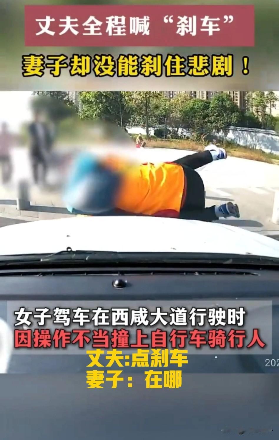 丈夫大喊“踩刹车”妻子反问“刹车在哪”[捂脸] 太惨啦!这名路人实在太无辜了,女司机径直朝着他撞了过去,丈夫大喊“踩刹车”也于事无补,事发时她全程尖叫不止,手忙脚乱。 12月20日,“陕西交警”发布了一条交通事故视频,女司机的迷之操作,惊呆网友。 女司机因操作不当径直撞向路边骑自行车的男子,而坐在副驾的丈夫全程嘶吼“刹车”却未能阻止的悲剧的发生。 更搞笑的是,视频中妻子慌乱反问“刹车在哪?”真让人哭笑不得呀!真不知道这驾照是怎么考来的,被撞男子经碾压后抢救无效身亡,真是一条活生生的人就没了,害人害己呀! 真的有驾照和会开车是两回事,建议各位宝子们拿到驾照,千万千万别着急上路,可以找个封闭没人的地方多练练。 开车上路没有小事,尊重自己和他人的生命,祝大家安全驾驶,平安相伴!