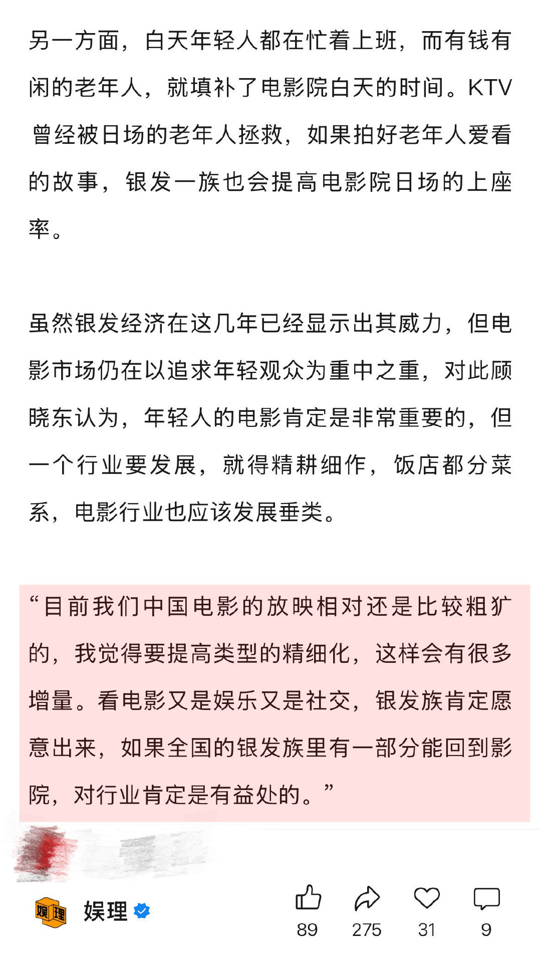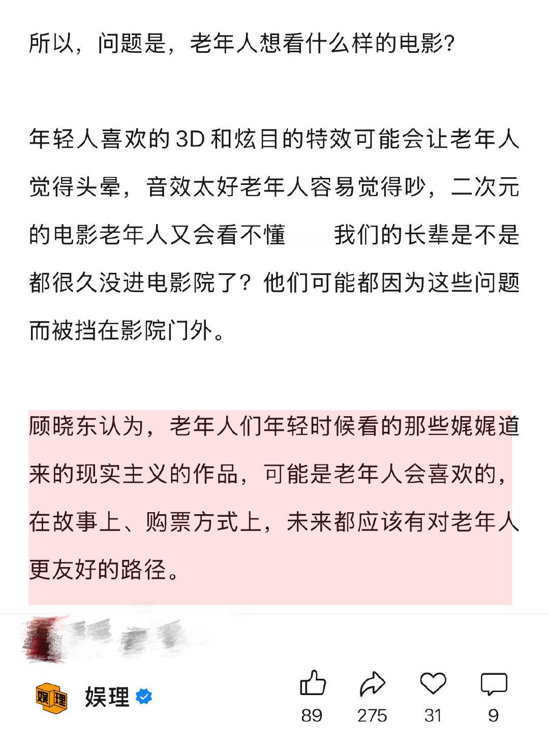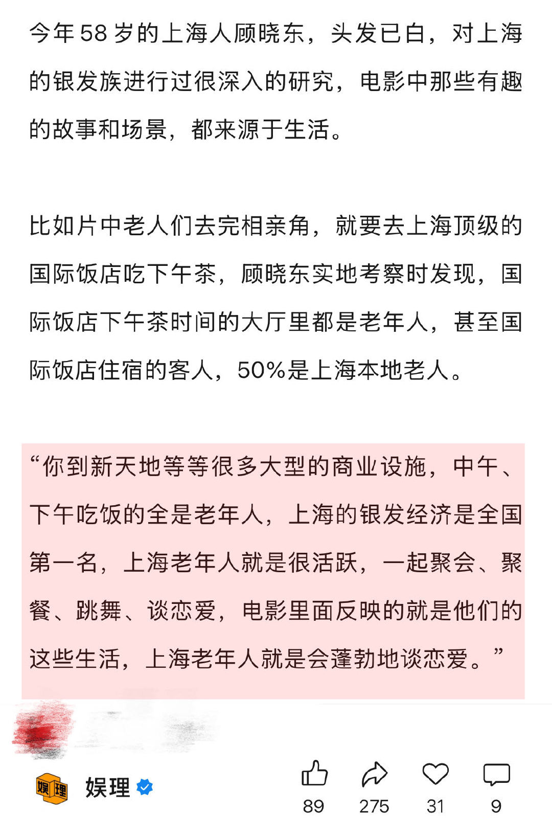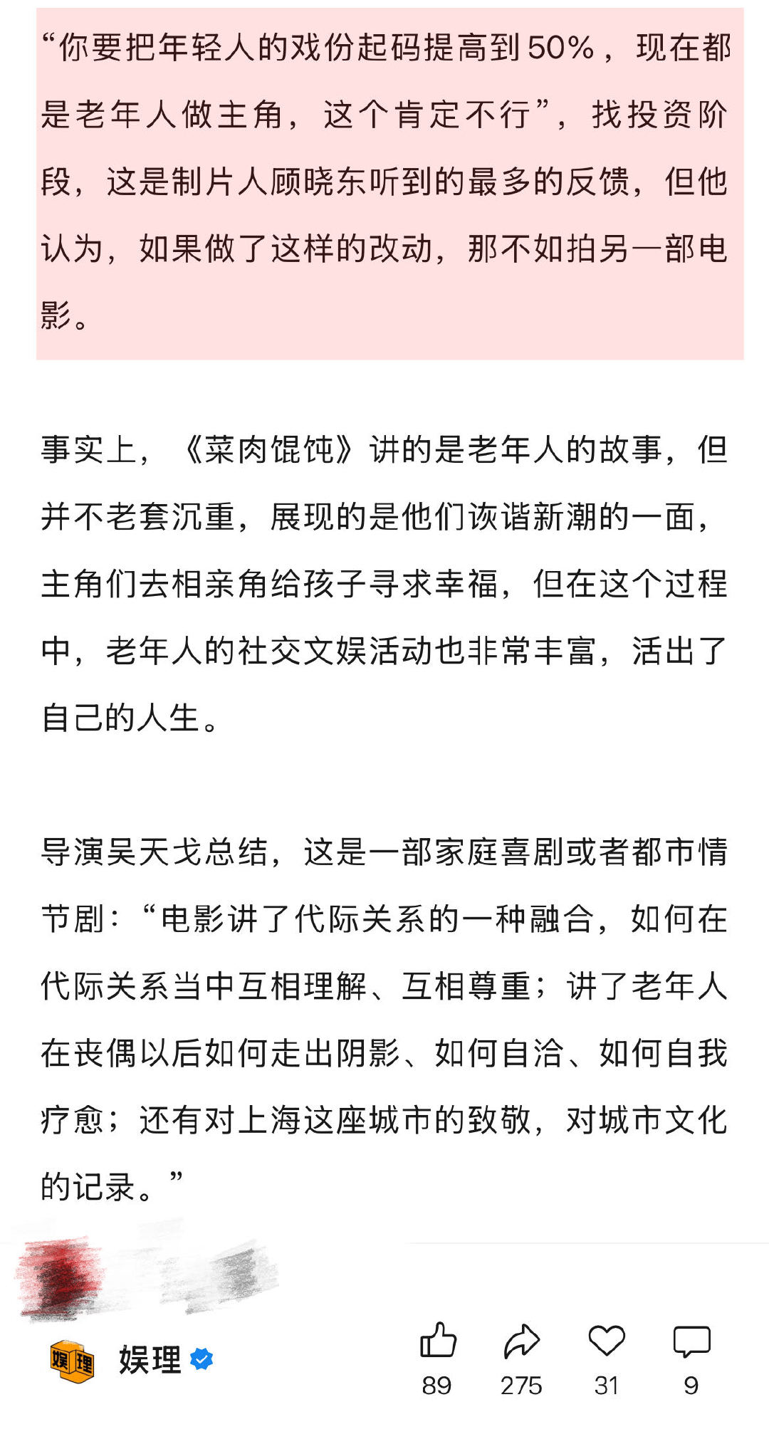 菜肉馄饨做对了什么 主创回应菜肉馄饨为何能小爆 上海老年人丰富的生活不仅是故事的基础,银发经济也是增量。在《菜肉馄饨》的线下宣传点位,会有工作人员教老年人购票。如今网上常说电影票贵的问题,但制片人顾晓东在线下发现,老年人对于票价其实接受良好。“上海的老年人还是比较有消费能力,他们看到电影票价就会说是一杯咖啡的钱,不贵不贵。”娱理独家↓
