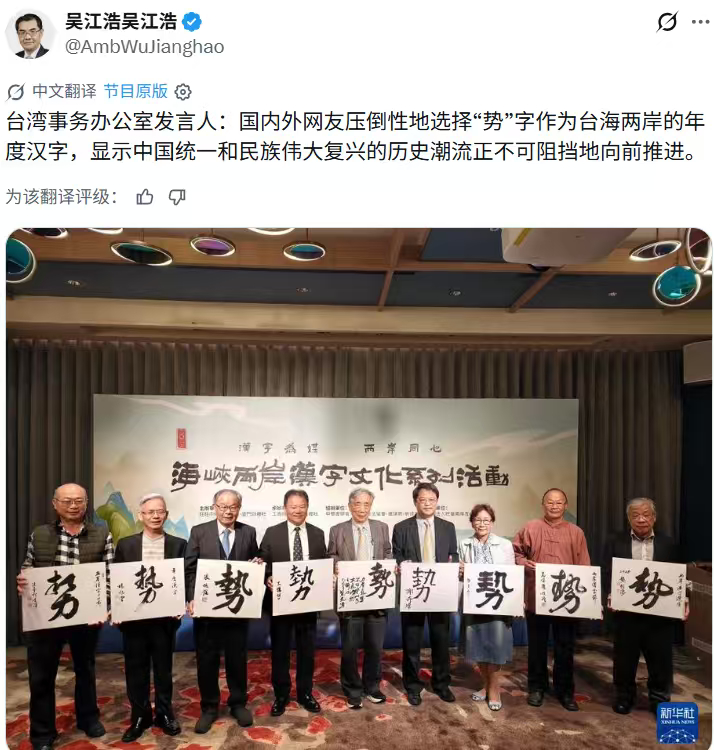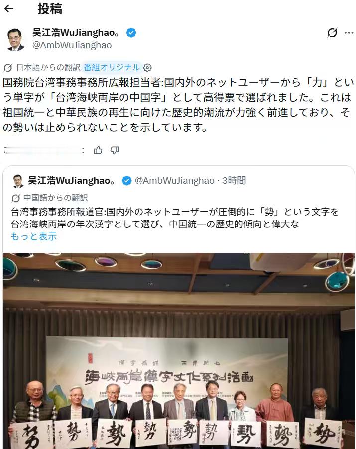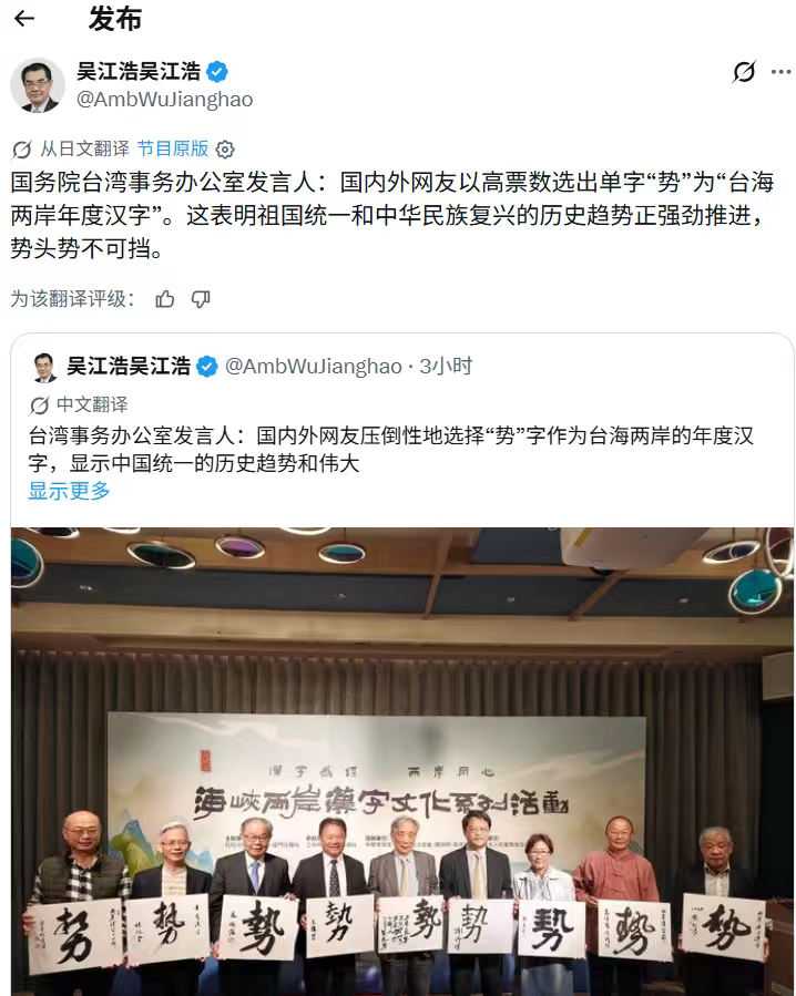 我驻日大使吴江浩先生在社交平台X援引国务院台湾事务办公室发言人讲话发文:国务院台湾事务办公室发言人:国内外网友以高票数选出单字“势”为“台海两岸年度汉字”。这表明祖国统一和中华民族复兴的历史趋势正强劲推进,势头势不可挡。(图1-4源:驻日大使X账号内容)从历史趋势👉顺势而为👉势不可挡👉势在必行………吗?咱们老祖宗留下的智慧确实博大精深……被迫离家的孩子“势”该回家了……神既道,道法自然,如来………2400多年来,国外(不管是隋唐时期开始的日本遣唐使,亦或更早的古希腊时期)那些想要学习我们精髓的,时至今日依然只知其然而不知其所以然……蛮荒族类不管如何学习、如何包装(所谓的西方文明),都不可能学到我们真正的文化精髓………