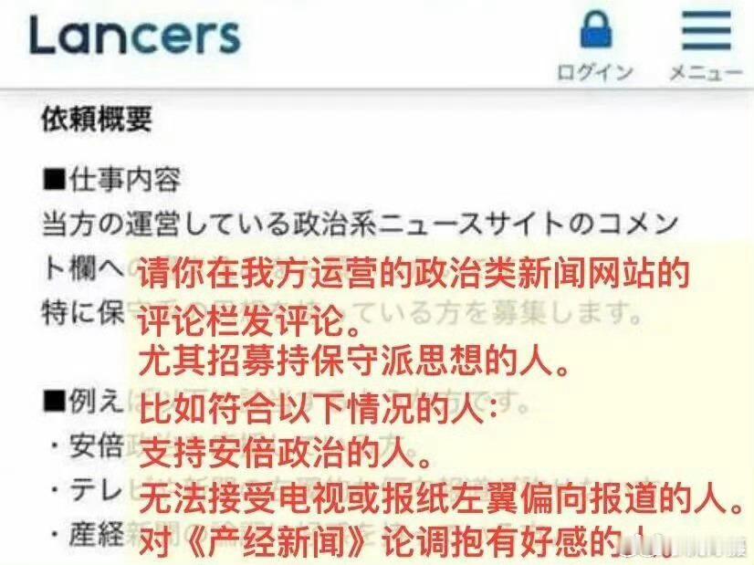 起底日本网络水军幕后黑手日网络水军发条视频最少2000日元【起底日本网络“水军”:发条视频最少2000日元】日本网络水军鼓吹右翼观点煽动对华仇恨 近日,日本大型众包平台CrowdWorks被曝长期发布网络招募信息,付费征集“批评中国”等内容的短视频。随着更多事实被揭露,一条操弄网络舆论的外包链条逐渐浮出水面——从散布仇恨言论到为右翼政治人物造势。日本网民质疑,在日本网络上浓重的保守派言论氛围背后,存在政治势力图谋操纵网络舆论的黑手。黄媒不会说的真相