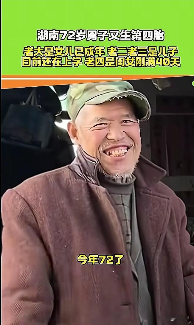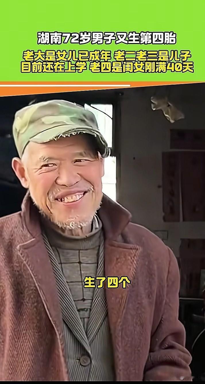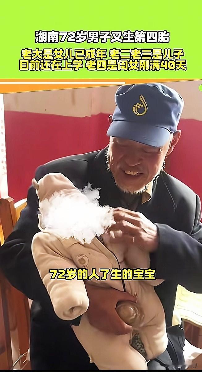 差点以为老眼昏花,定睛一看,72岁,第4胎! 大爷还得是大爷,生育这块,果然还得看老一辈! 既能拿养老金,又能拿生育补贴! 这大爷说:大女儿成年了,老二老三都是儿子,现在小女儿也40天了。 大爷抱着老来女,笑的直露大黄牙,还直言自己养幺女没问题,身体倍棒,吃嘛嘛香! 网友的评论简直绝了:大爷现在最怕的就是睁不开眼睛。 不得不说,高龄产妇生孩子,还是很危险的! 如果儿女双全,你还想要拼三胎四胎吗? 一起来聊聊生育这块,哪个年龄段的人最适合生小孩儿? 高龄生育 高龄晚育 老年人生育问题 生孩子