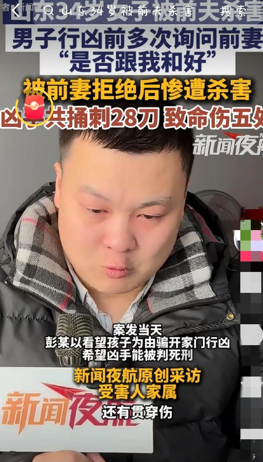 如果我没开门,妈妈是不是就能活下来?男子当着11岁儿子的面杀害前妻,28刀刺向的不只是曾经的伴侣,还有孩子弱小的心灵 2025年8月10日晚,山东临沂某小区发生一起惨剧,34岁的来青禾(化名)被赌徒前夫彭某当着儿子的面连捅28刀杀害,案件至今仍让人心有余悸。 来青禾与彭某2009年相亲结婚,婚后彭某嗜赌成性,2019年欠下40万赌债,来青禾为护佑家庭卖掉婚房还债。可彭某屡教不改,再次欠下百万赌债,甚至用尼龙绳捆绑来青禾施暴。2022年,来青禾通过诉讼离婚,独自抚养儿子,白天做超市收银员,晚上兼职卖衣服,终于在2025年还清债务。离婚三年来,彭某不仅没有支付抚养费,而且就连看望孩子的次数都少之又少。2025年7月,来某与一位年纪相仿的男士相识并订婚,眼看着新生活即将开始,可是悲剧却发生了。 彭某得知前妻再婚消息后,频繁电话骚扰辱骂,还在其家门口安装隐蔽摄像头监视。案发前5天,来青禾报警求助,却未能阻止悲剧。8月10日晚,彭某以看望孩子为由骗童童(化名)开门,之后带孩子买完零食返回后,便质问来某是否愿意和自己和好,看到迟疑的来某,彭某拿起水果刀在客厅就捅了来某4刀,之后又将来青禾推搡进卧室行凶。尽管童童怎么哭喊阻拦、敲门求救可是依然没有让彭某改变主意,以至于孩子眼睁睁看着母亲被刺28刀,其中5处致命伤,挣扎十多分钟后离世。彭某行凶后静坐抽烟,毫无悔意。 案发后,童童被诊断为抑郁症,沉默寡言、时哭时笑,总担心家人抛弃自己。死者弟弟来柏君痛哭,他说姐姐一生善良勤劳,却因赌徒前夫付出生命代价,家人拒绝任何赔偿,只求法院判处彭某死刑。目前案件已进入公诉阶段,计划2026年1月开庭审理。 亲眼目睹一切的孩子,他的心理阴影得有多大!那个残忍的凶手,他的所作所为不仅毁了来青禾的一生,更将童童的未来彻底摧毁。那28刀更是刺在了孩子幼小的心灵上!彭某作为丈夫,作为父亲都是一个失职的人,他应该接受正义的审判,法律唯有严惩凶手才能告慰逝者!可怜的孩子,希望他能在亲人以及社会各界的关爱下逐渐走出阴霾,重新拥抱生活。