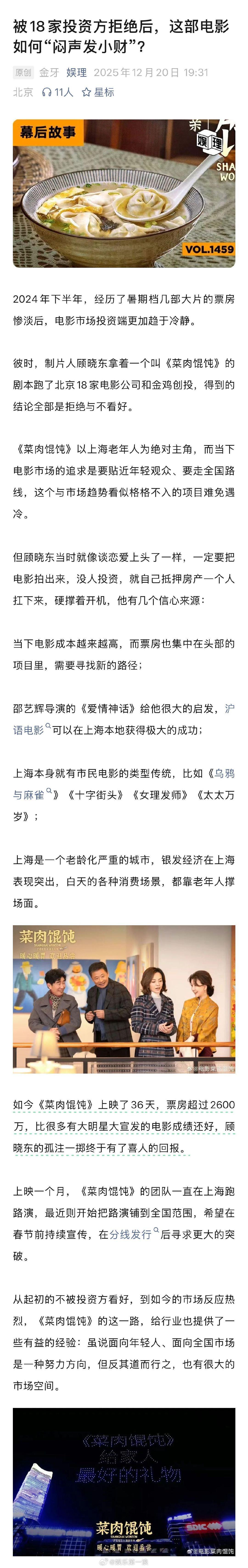 菜肉馄饨做对了什么 主创回应菜肉馄饨为何能小爆 《菜肉馄饨》制片人顾晓东在投资阶段,曾听到最多的反馈是“你要把年轻人的戏份起码提高到50%,现在都是老年人做主角,这个肯定不行”。但他认为,如果那样改的话不如拍另一部电影。《菜肉馄饨》虽然讲的是老年人的故事,但并不老套沉重…娱理独家↓
