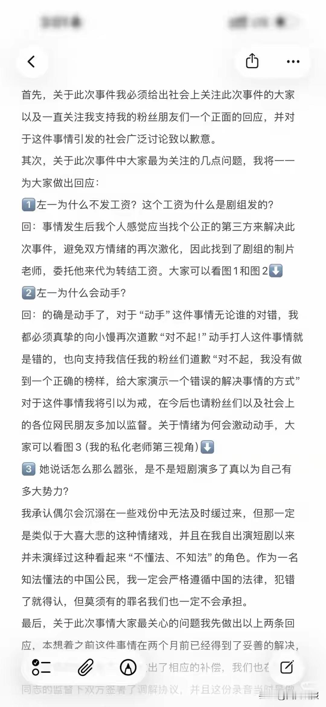 看看左一的作品产量,就知道她道歉信所言非虚‼️ 光一个平台62部作品,她值得被原谅‼️ 除了王格格56部相差不多,其余基本都是30部左右,就是56部的量,王格格在采访里已经说自己忙到没时间谈恋爱,甚至连信息都没时间回了! 可想而知,左一大部分时间都是活在剧情里,这也是她说的偶尔会沉溺在一些戏份里,无法及时抽离的原因。压力无处释放,情绪肯定会经常崩,酗酒抽烟应该也是常态,短剧演员的身体真的不能等亮红灯了再去关注‼️ 打人固然不对,她也深刻反省了,相信媒体和大众都会理性看待,毕竟,谁的职场是容易的⁉️ 左一为打助理道歉 左一