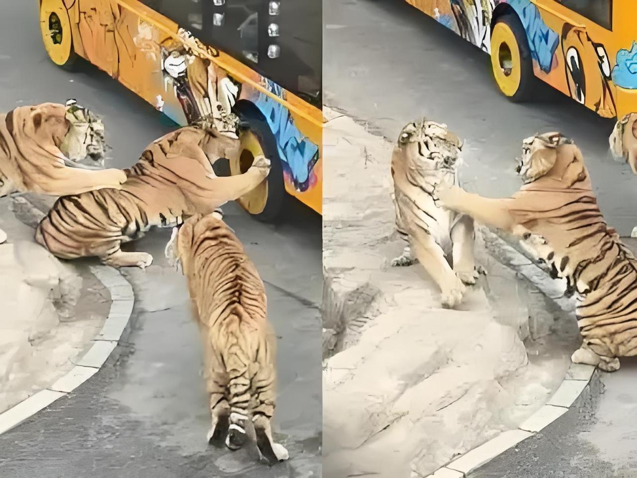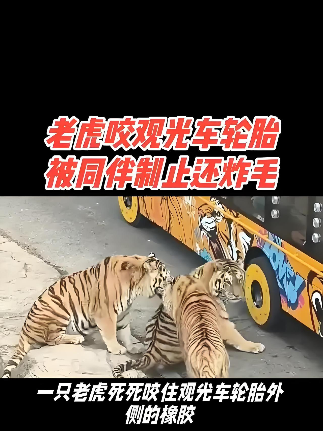 老虎死咬观光车轮胎不放,同伴劝架反被怼“炸毛”,网友:这虎是真虎! 辽宁一野生动物园上演离谱名场面!一只东北虎对着观光车轮胎“一见钟情”,死死咬住橡胶不放,任凭车子缓缓挪动,脑袋跟着车轮摇得像拨浪鼓,活脱脱跟轮胎较上了劲,车内游客又惊又笑,直呼“门票钱值回了”! 这只“肇事虎”咬得那叫一个投入,利齿都快嵌进轮胎里,车身都跟着轻轻晃动,眼看轮胎外皮都要被撕下来,旁边一只体型更大的老虎看不下去了——慢悠悠走过来,用身子一趴一挡,妥妥的“劝架”姿态,硬是把它从轮胎上拽了下来。 可谁能想到,被打断“雅兴”的老虎瞬间翻脸!全身毛发竖起、尾巴高高翘起,对着劝架的同伴龇牙咧嘴,当场“炸毛”,那架势仿佛在喊“多管闲事!我还没玩够呢”,最后还追着同伴跑了好几步,把劝架虎搞得一脸无辜,画面又惊险又滑稽。 为啥老虎会跟轮胎过不去?专家解释,橡胶的气味、弹性,再加上车辆移动的反馈,对捕食本能极强的老虎来说,就像个新奇“玩具”,很容易激发探索欲。而劝架的老虎大概率是圈养环境里的“年长前辈”,在纠正年轻个体的越界行为,毕竟老虎咬合力高达450公斤,真把轮胎咬坏了,对双方都有风险。 网友们看完笑疯了:“这虎怕不是把轮胎当成五花肉了?”“劝架虎:好心没好报,下次再也不管了”“炸毛的样子像极了被打断追剧的我”!园方后续回应,游客全程安全无恙,已对车辆做了全面检查,目前一切正常。
