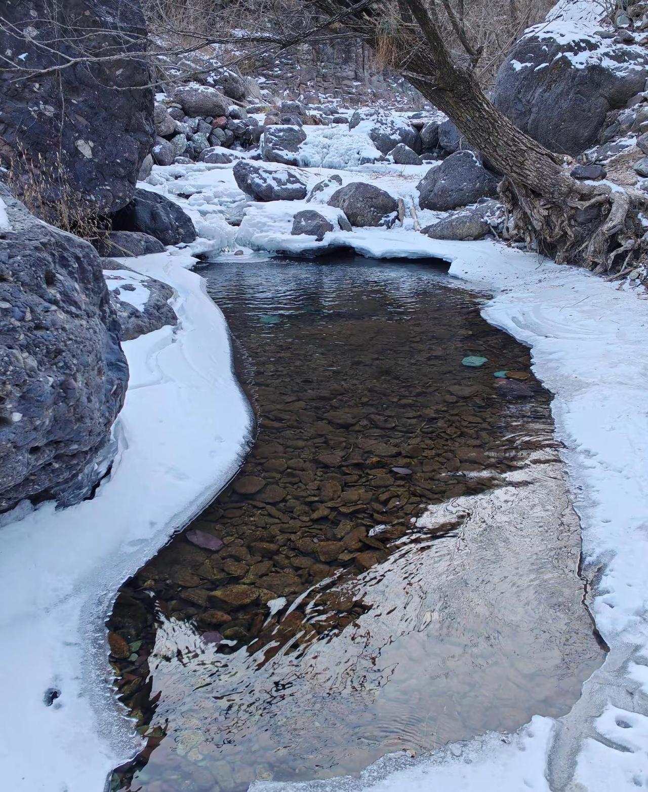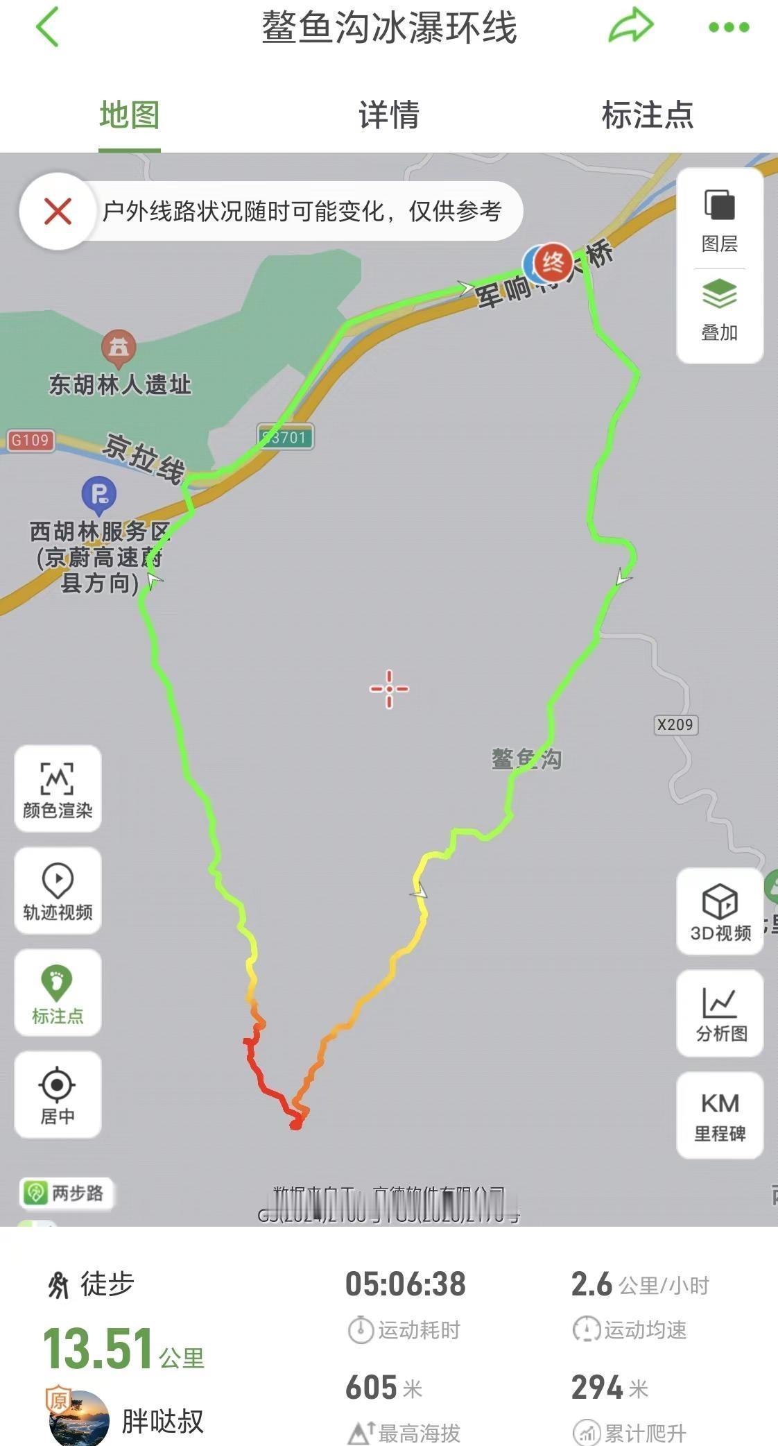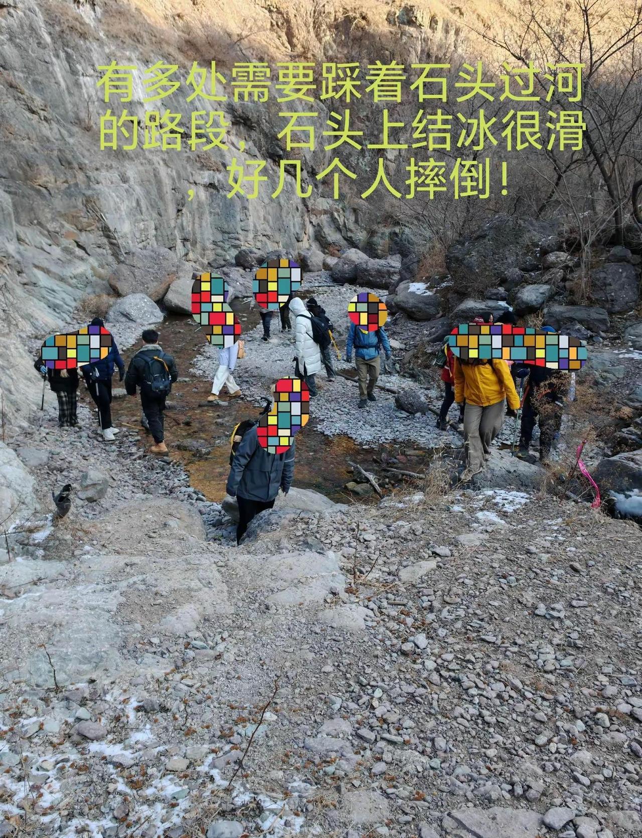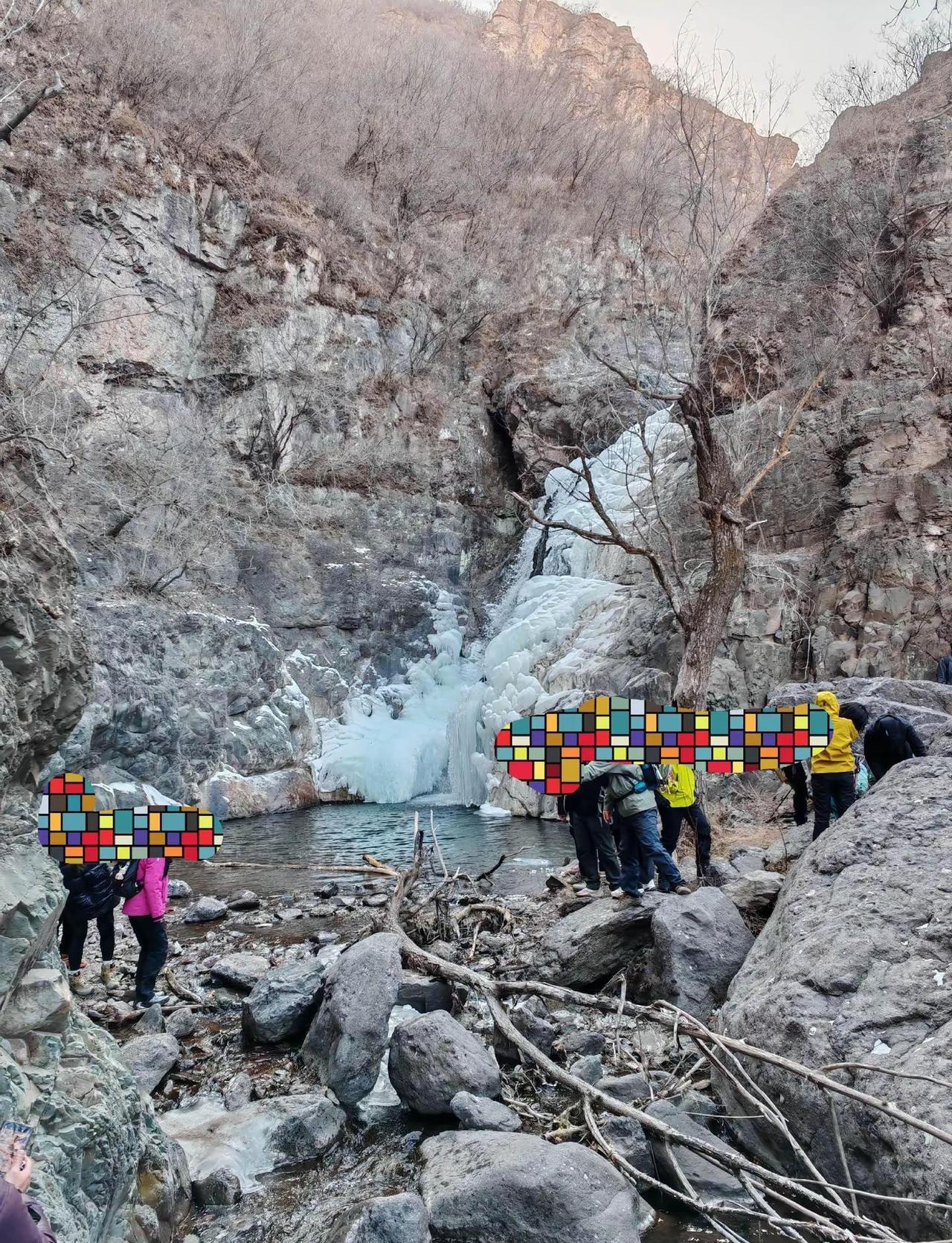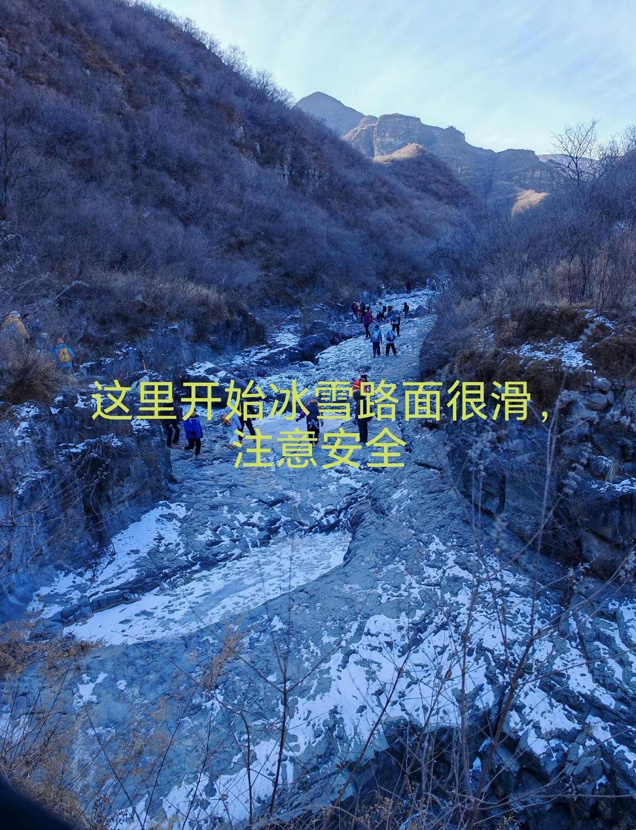 车程1小时闯进北京的冰雪世界,看大冰瀑!❄️这里的冰瀑比瓜草地的规模要大一些,爬升也比较低,一路沿着小溪前行,一路上都有嬉水的快乐,白雪皑皑、溪流潺潺!这里就是位于门头沟斋堂的-鳌鱼沟!👋先说一些重点和注意事项:1、自驾的话徒步里程为14公里,跟团10公里,爬升一样!这里详细说明,如果自驾的话无论导航军响村或者有辙驿站进出都需要走4公里左右的公路,如果跟团大巴车会把人送到起点(图1),之后大巴车会去到有辙驿站接人,这样比自驾的少走几公里!2、冰雪路面很滑,有多处需要踩石头过河的路段,石头上有冰很滑,我看到有不少人摔倒所以登山鞋也不能完全防滑,建议穿高帮鞋,可以在水浅的地方直接趟水走过去不踩石头!🚗导航:军响村!可以在路边空地停车!🚾:导航终点就有一个卫生间,军响村再往前走沿途有三四个卫生间!🍔补给:也可以导航到:门头沟区有辙驿站(斋堂店),这里有咖啡、简餐、小停车场、卫生间,这里也是商团接人的地方!👣线路强度:以自驾为例,徒步里程14公里,爬升300左右,整体强度不大,其中山路大概只有7-8公里的样子,其余都是柏油公路和水泥路!不建议在有辙驿站走反穿,到冰瀑的时候旁边那个崖很难下不如上简单,有很大危险,而且反穿会把正穿的人堵住!前半程为大石头、溪流涉水和冰雪路段,湿滑易摔倒,后半程为小碎石和部分冰雪路段同样很滑易摔倒!⚠️难度和危险性:整体来说除了湿滑易摔倒外就是冰瀑旁边的那个大坡有难度,坡度很大、陡峭而且顶端很窄,我觉得连半米宽都没有,需要贴着崖壁走,这里一定注意安全,不要分心,对于带孩子的家长来说这里是一个不小的挑战!❤️建议:山谷里阴冷、山顶风大,一定带厚帽子、厚手套,热水和高热量食物也必不可少!户外徒步