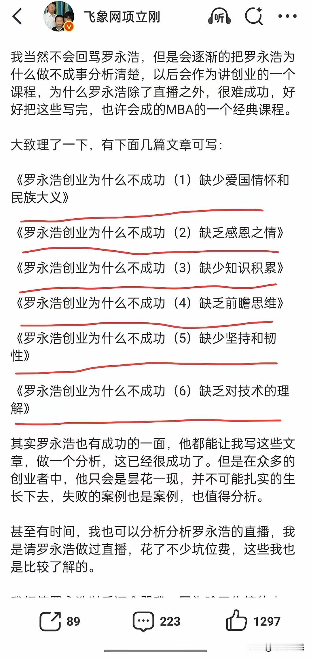 没等到罗永浩狠垂华与华,却等到了项立刚狠垂罗永浩。罗永浩一次次提录音,又一次次没动静,有网友催更,被他臭骂一通。现在项立刚预告罗永浩不成功都六大原因,扬言做个详细分析。希望项立刚说到做到。就看他俩谁的瓜上架快,先发有优势。比如项立刚放的瓜太香,罗永浩的瓜可能就不香了。起跑枪已响,看谁先到终点。