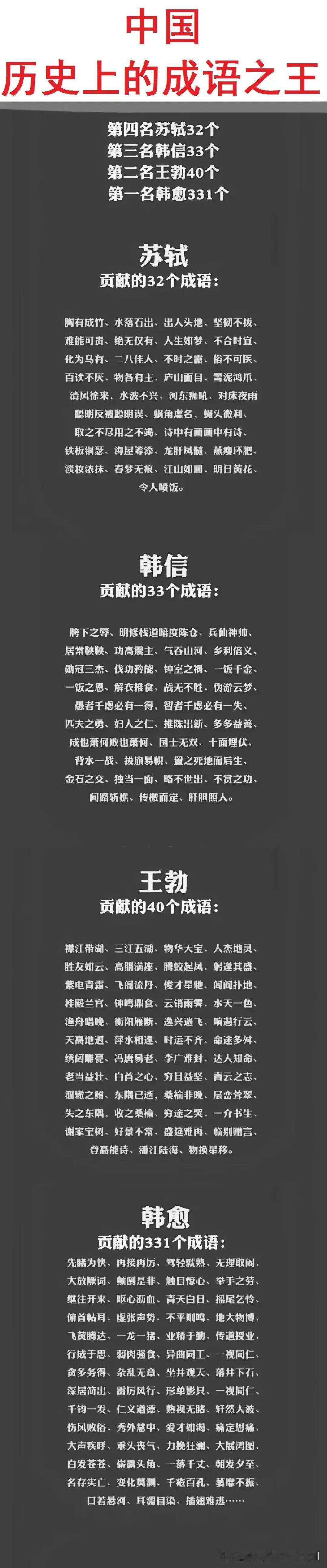 韩愈,是造成语冠军。 韩信,是造成语的季军。 在我国历史上,一个人如果能有一个成语和他相关,是一件很伟大的事情。 就像破釜沉舟这个成语,听到这个词,第一时间必然会想到项羽。 但是项羽一生留下了有20多个成语。 那就再举个其他例子,像东施效颦这个词,简直是东施这个丑女一生的巅峰。 而韩愈和韩信不同之处,就在于韩愈的成语都是自己造的。 而韩信的成语,都是司马迁给他造的。