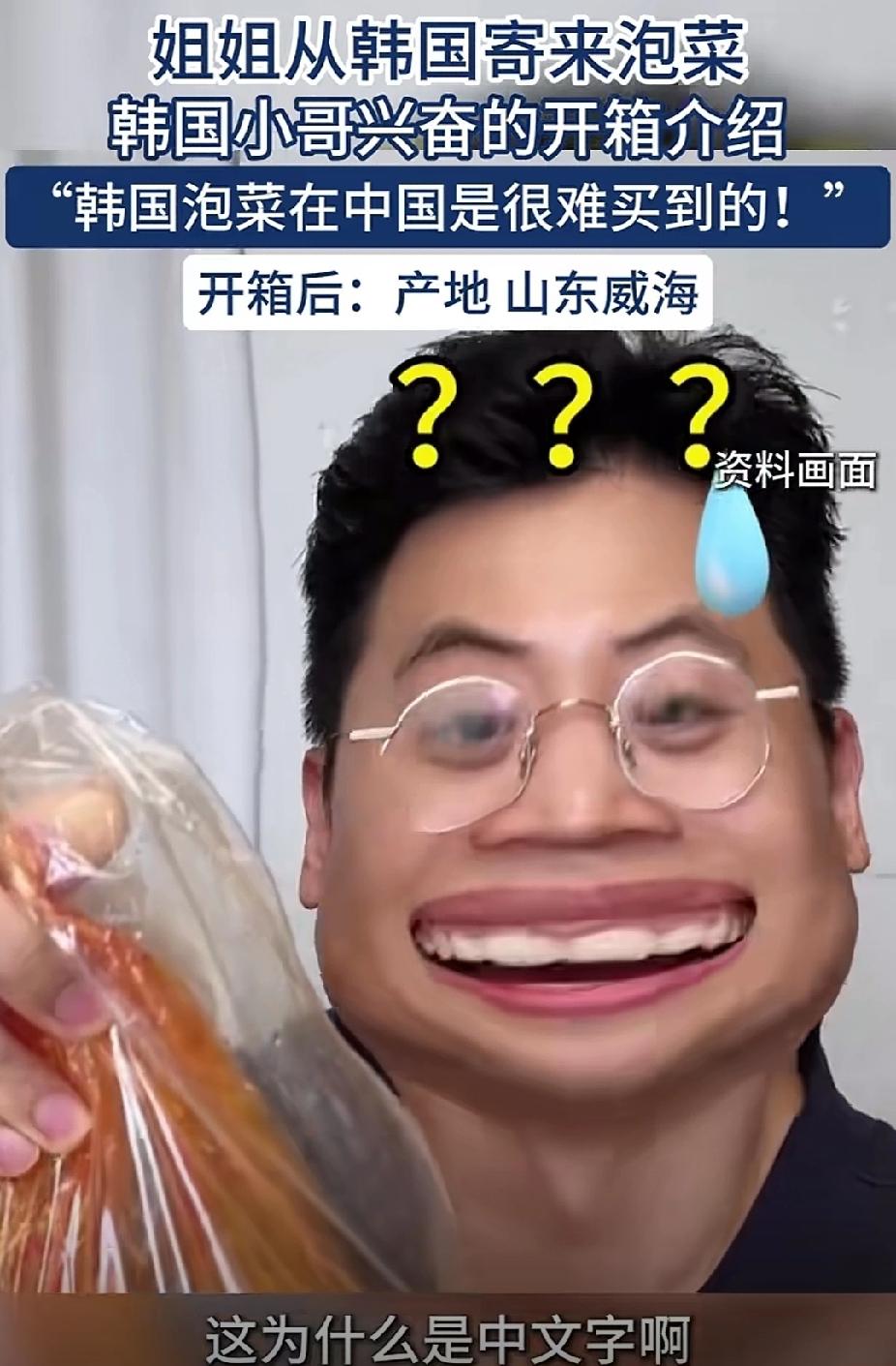 一韩国博主兴致勃勃的给网友们展示姐姐从韩国寄来的泡菜,还说什么韩国泡菜在中国是很难买到的,拿出泡菜袋,看到包装袋上的商标,博主被叭叭打脸,产地竟是中国山东,吃了半辈子为之骄傲的本国标志美食竟然是别国产的,可怜的小哥,内心应该受伤了,快吃点姐姐寄来的泡菜安慰安慰受伤的心灵吧!