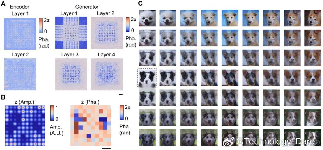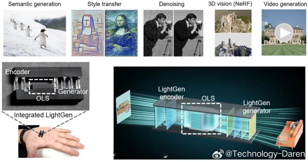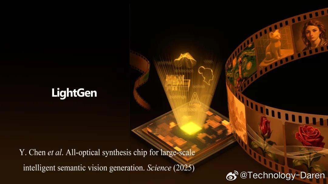 最新科技消息 【我国首次实现支持大规模语义媒体生成模型的全光计算芯片】上海交通大学集成电路学院(信息与电子工程学院)陈一彤课题组在新一代算力芯片领域取得重大突破,首次实现了支持大规模语义媒体生成模型的全光计算芯片,相关研究以“All-optical synthesis chip for large-scale intelligent semantic vision generation”(大规模智能语义视觉生成全光芯片)为题发表于国际顶级学术期刊《科学》(Science)上。上海交通大学为论文第一作者和通讯作者单位,陈一彤助理教授为第一作者及通讯作者。这是上海交通大学集成电路学院(信息与电子工程学院)成立以来首篇第一单位且独立通讯单位的《Science》正刊论文!研究团队首次提出全光大规模语义生成芯片LightGen,这也是国际首次实现的大规模全光生成式AI芯片,在单枚芯片上同时突破了百万级光学神经元集成、全光维度转换、无真值光芯片训练算法的领域公认瓶颈。论文实验验证了全光芯片LightGen在高分辨率(≥512×512)图像语义生成、3D生成(NeRF)、高清视频生成及语义调控、去噪、局部及全局特征迁移等多项大规模生成式任务。不再让电辅助光生成,而是让全光芯片完整实现输入图像、理解语义、语义操控、生成全新媒体数据的端到端过程,即让光“理解”和“认知”语义。此外,LightGen采用了极严格的算力评价标准,在实现与电芯片上运行的Stable Diffusion、NeRF、Style Injection Diffusion等前沿电子神经网络相仿生成质量的同时,直接测量整个系统端到端的耗时与耗能降低。实测表明,即便采用较滞后性能的输入设备,LightGen仍可取得相比顶尖数字芯片2个和2个数量级的算力和能效提升。而如果采用前沿设备使得信号输入频率不是瓶颈的情况下,LightGen理论可实现算力提升7个数量级、能效提升8个数量级的性能跃升。这不仅直接体现了在不损失性能情况下替换顶尖现有芯片能获得的巨大算力和能效提升,也印证了解决大规模集成、全光维度变换、无真值光场训练等关键难点,全光片上实现大规模生成式网络的重要意义。论文同步被《Science》官方选为高光论文重点报道。论文中提到,生成式AI正加速融入生产生活,要让“下一代算力芯片”在现代人工智能社会中真正实用,势在必行的是研发能够直接执行真实世界所需任务的芯片——尤其是大规模生成模型这类对端到端时延与能耗极其敏感的任务。面向这一目标,LightGen为新一代算力芯片真正助力前沿人工智能开辟了新路径,也为探索更高速、更高能效的生成式智能计算提供了新的研究方向。网页链接