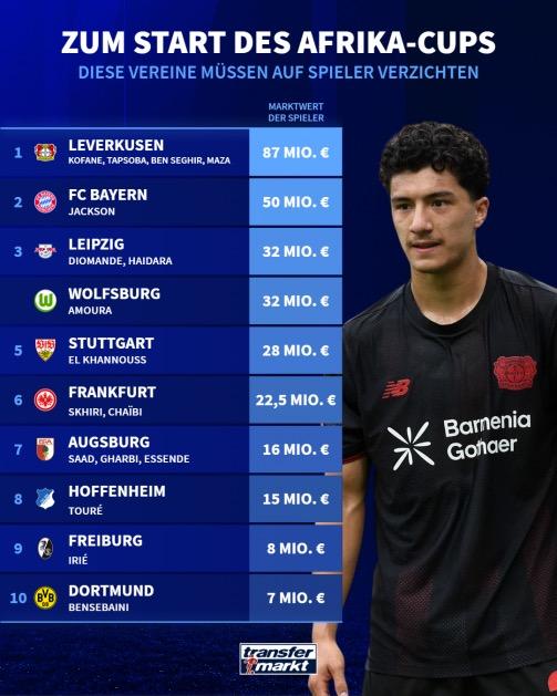 虎扑12月21日讯德转统计了德甲各队参加非洲杯离队的球员总身价榜。