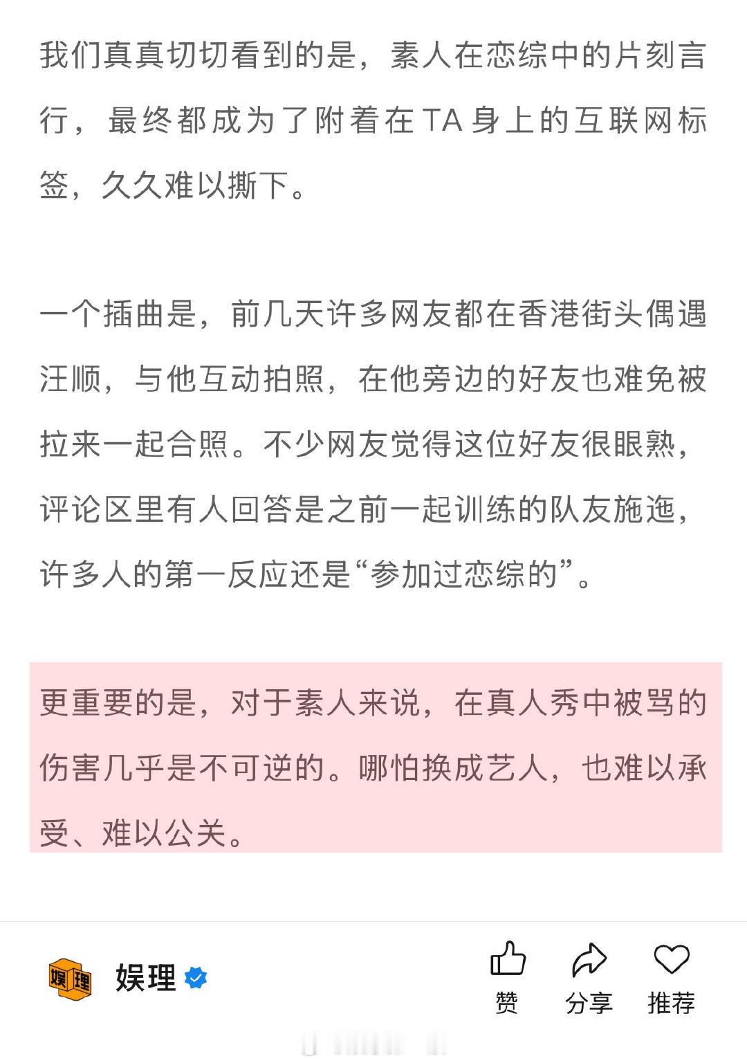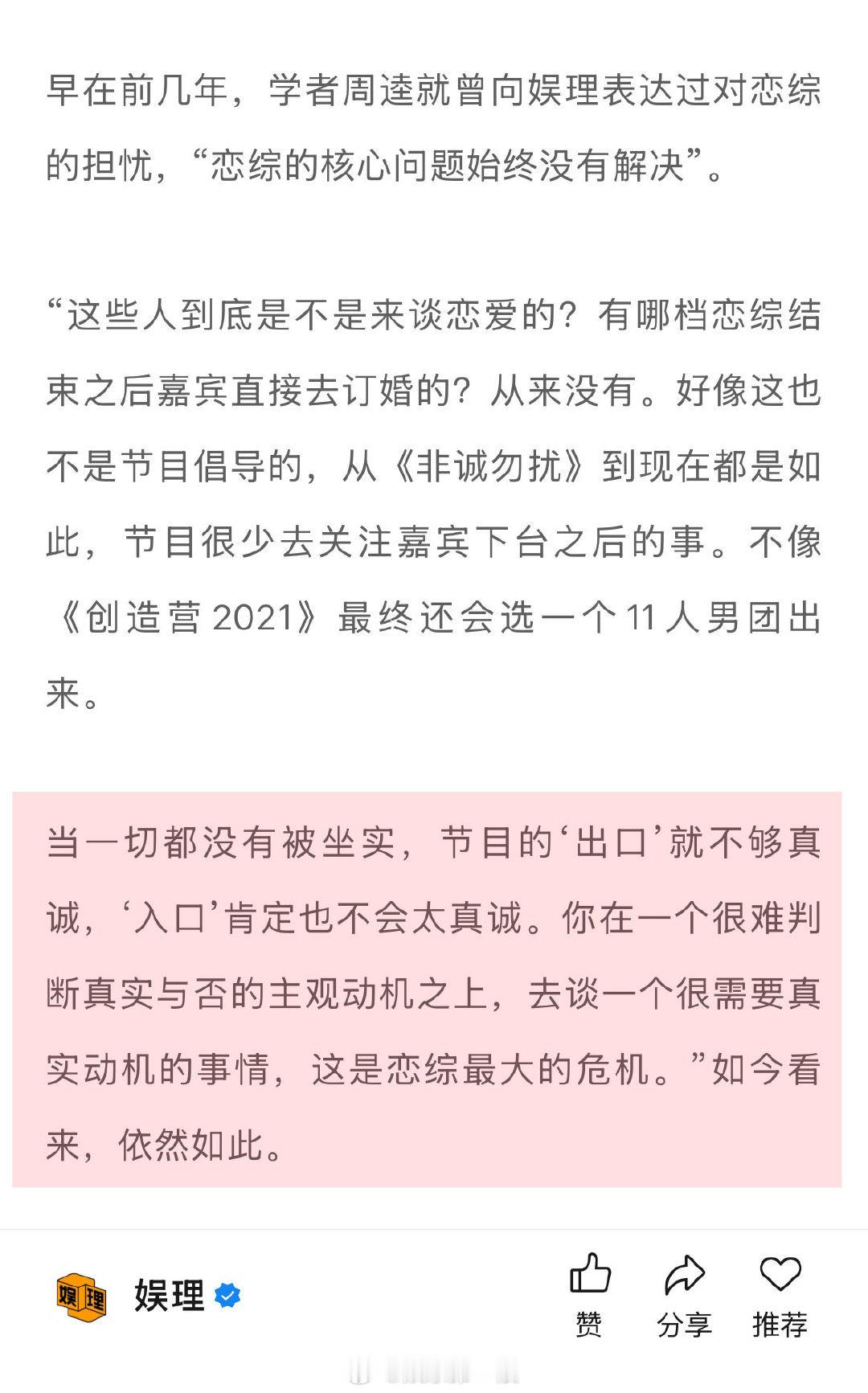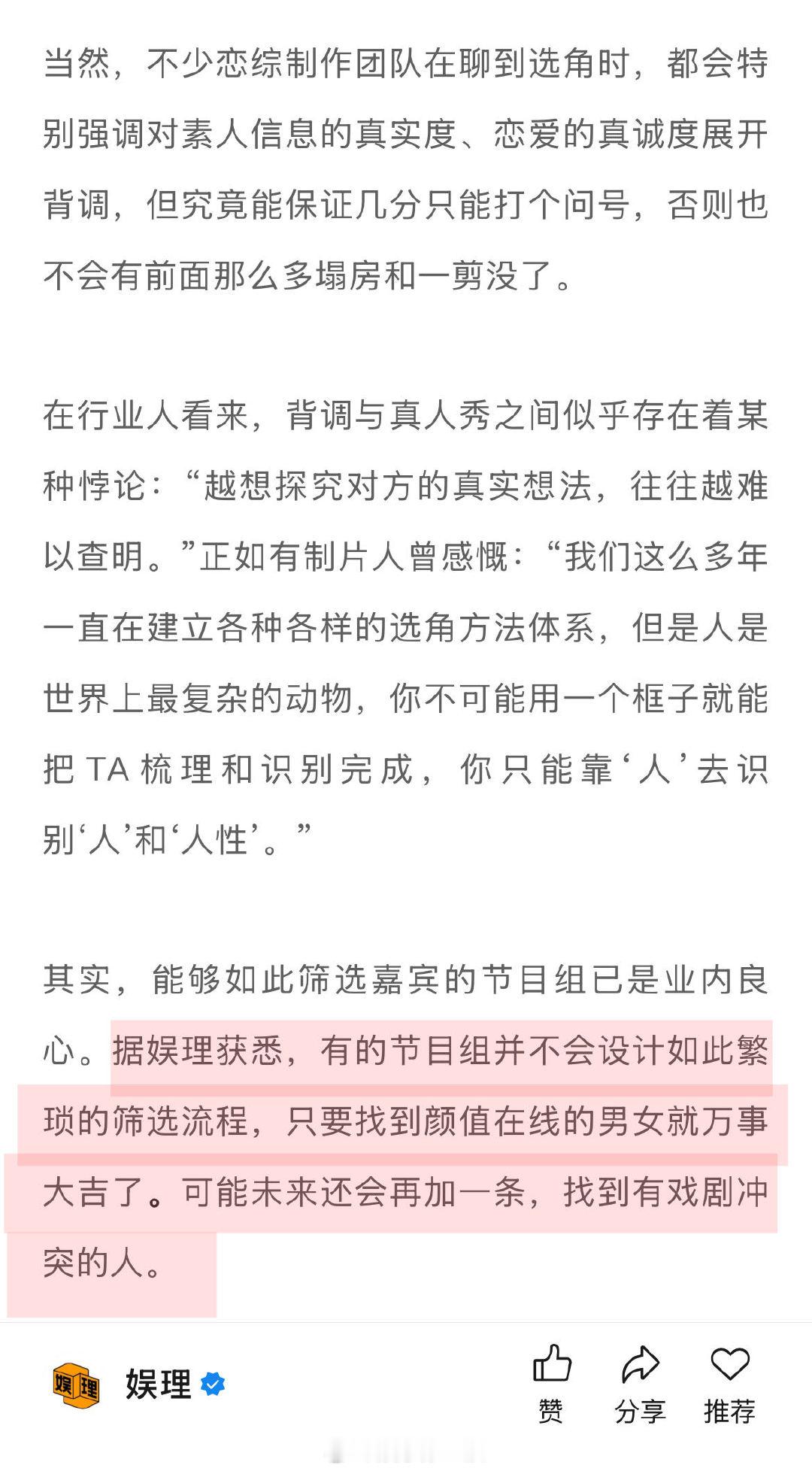 恋综靠狗血出圈是好事吗 如何看待王梓莼宾利哥出圈 不少恋综制作团队在聊到选角时,都会特别强调对素人信息的真实度、恋爱的真诚度展开背调,但能保证几分只能打个问号,否则也不会有前面那么多塌房和一剪没了。在行业人看来,背调与真人秀之间似乎存在着某种悖论:“越想探究对方的真实想法,往往越难以查明…”娱理独家↓