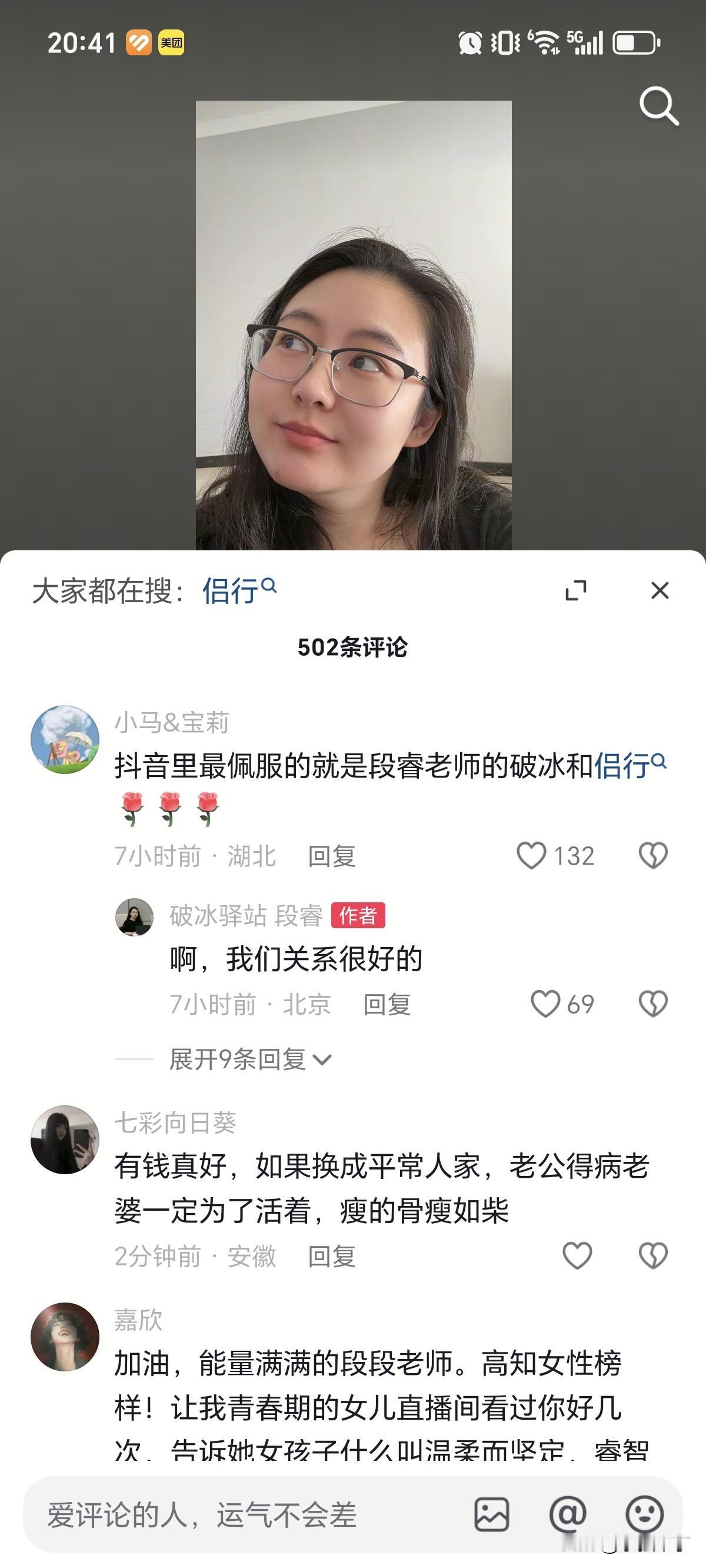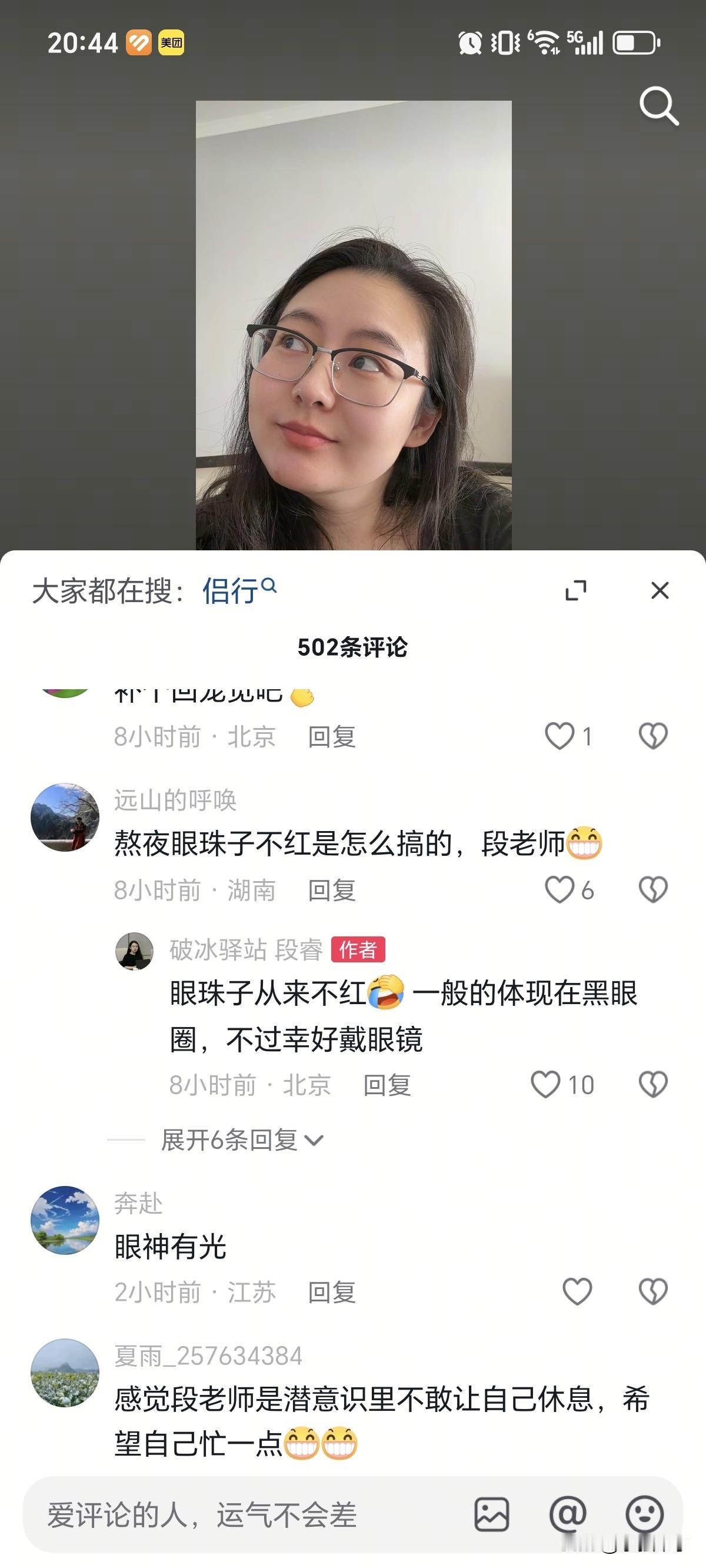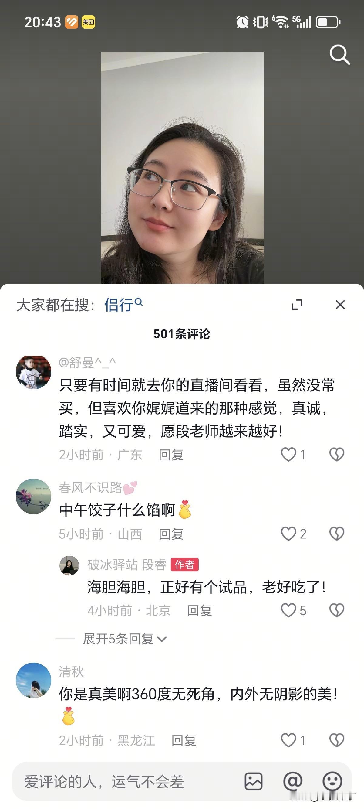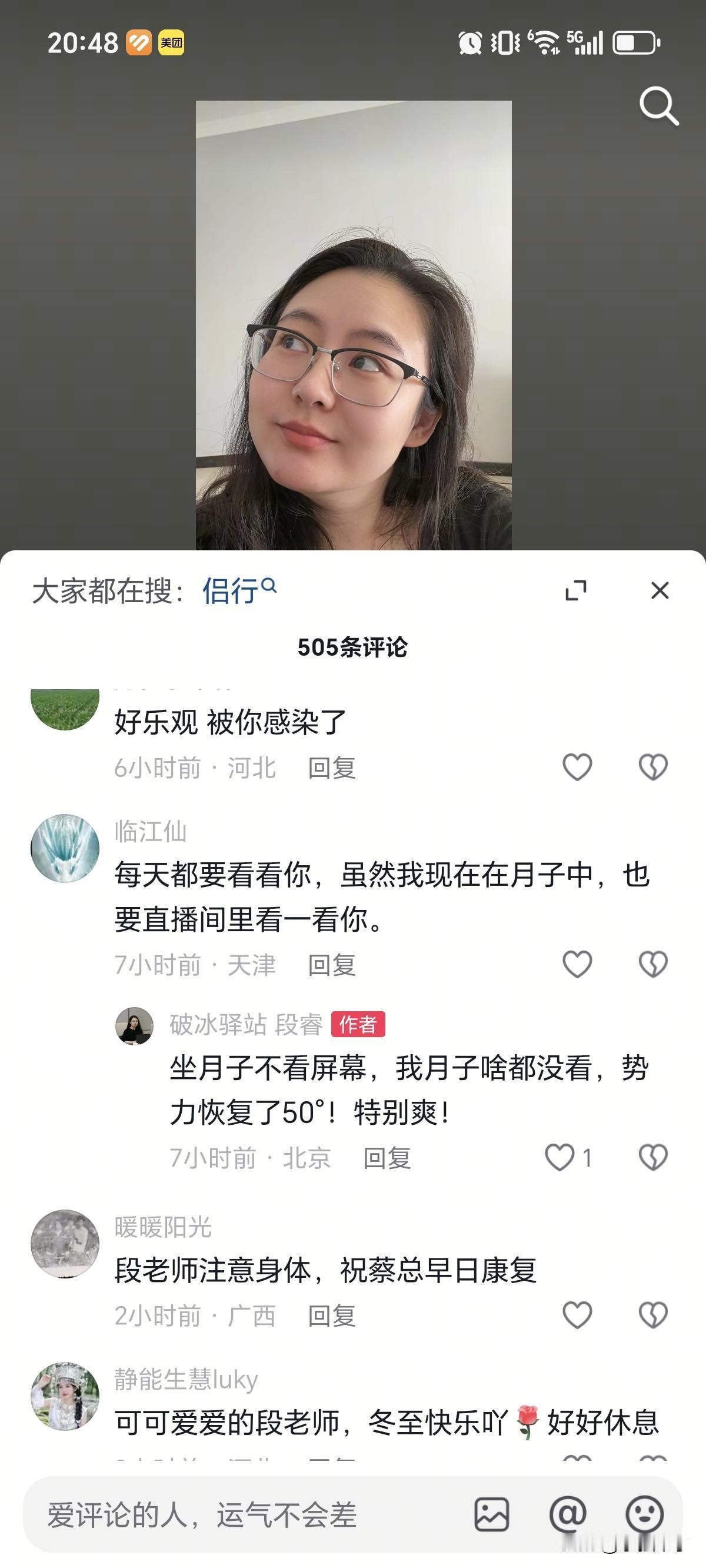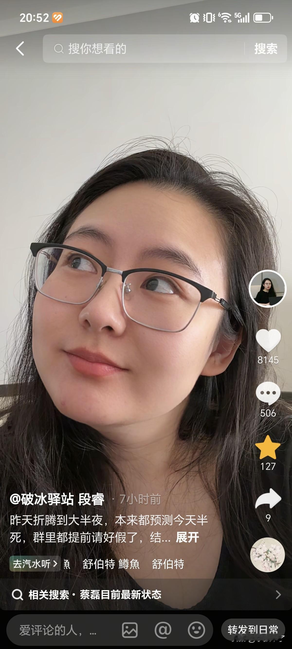 12月21号,36岁的段睿发文说:自己简直就是“牛马圣体”!原来昨天凌晨突然身体不舒服,折腾了大半夜,按照以往经验,推测明天会“半死”状态,与其耽误直播效果,不如休息,所以提前在群里给手下员工请了假,没想到,后半夜睡了几个小时,早上没有闹铃,准点醒了,感觉满血复活,浑身充满了力量,收拾收拾继续工作了。 都说女人口是心非,段睿精心准备的一张配图就是最好的证明,只见眼睛往左边看,明显的红血丝都出来了,另外下巴有一颗红色的痘痘,结合2点,就是严重的休息不足,压力大,上火导致。之所以对外说“牛马圣体”,无非工作需要,装作很强大,实际,内心依然是想被“保护的小女生”,可命运如此安排,不得已不接受,哎,全凭救活老公蔡磊那股子念头支撑着,不容易呀。 另外段睿在评论区和网友的互动,也释放了几点信息。 第一,原来私下和侣行也是好朋友。 第二,很节俭,今天是冬至,就把厂家送来的品,海胆馅饺子吃了。 第三,由于长期熬夜,黑眼圈很明显,庆幸的是正好被眼镜框挡上了。 第四,太自律了,月子期间,坚持不玩手机,没想到,视力恢复了50°。 写在最后,想说,即使当“牛马“也要身体健康,否则伤心的永远是父母。