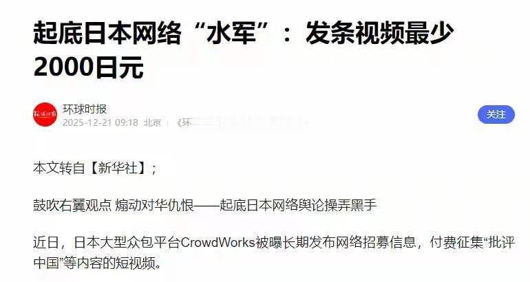 原来都是注水的!高市早苗的高支持率被揭秘! 据媒体消息,高市早苗购买“水军”的事实被揭露。据介绍,在日本CrowdWorks众包平台上,被发现日本自民党长期招募“网军”信息,被付费制作“抨击中国”的制作,并同时给日本右翼政治人物造势。要制作的内容要突出“日本的优秀”和所谓的“中国不文明举动”,而给予的报酬在200-4000日元(约人民币90-180元)之间。 高市早苗当选后的支持率一直居高不下,而她在错误言论后更是只逼80%,这让人误以为以高市早苗代表的右翼已经覆盖了整个小本子。而实际上,她只是刚刚勉强组阁成功1个月时间,在什么都没有做的情况下,而且期间还有因为极度谄媚特朗普,让小本子民众极度不适的情况下,拿到这么高的支持率几乎是不可能的。 现在她购买“水军”让人揭露,这一切就都顺理成章了!原来这么高的支持率里面是被严重被注水了!