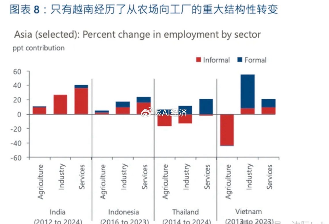 在过去十年中,亚洲主要新兴经济体的就业结构演变路径出现显著分化,其中只有越南经历了从农业向工业部门的重大结构性转变。相比之下,印度、印尼和泰国的就业增长主要集中在服务业及工业部门的非正规岗位,其农业部门的劳动力转移规模则相对温和,未能实现与越南类似的、由大规模制造业投资驱动的深刻经济结构转型。