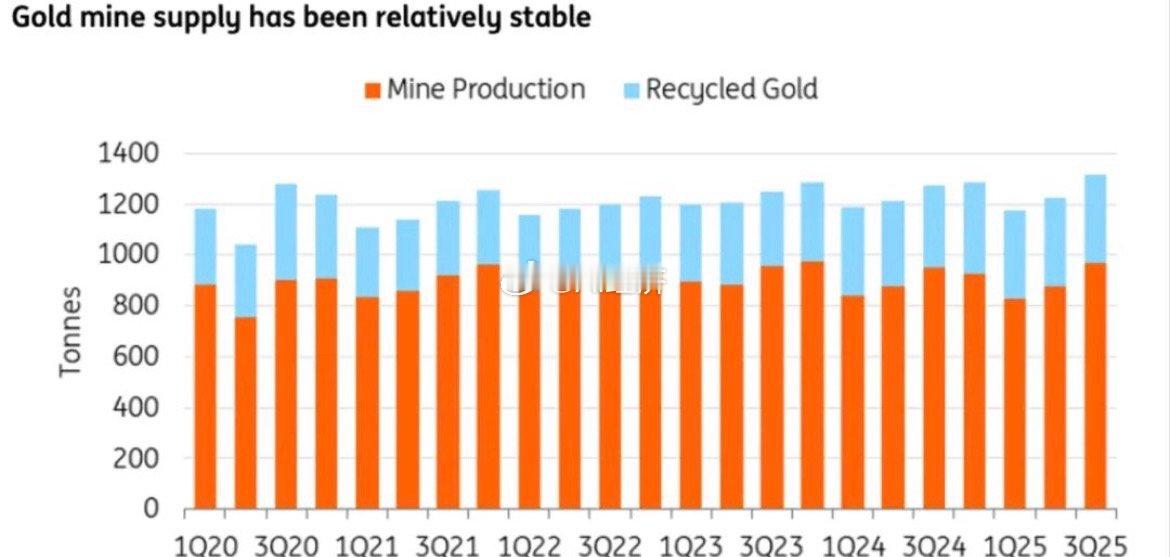 根据世界黄金协会的数据,全球黄金总供给在近年来表现出高度的稳定性,其季度供给量基本维持在1100至1300吨的区间内窄幅波动。这一供给结构由矿产金和再生金两部分构成,其中矿产金作为主要来源,其产量增长缓慢且缺乏弹性。因此供给端微小的产量变化通常不会对金价产生显著的影响。