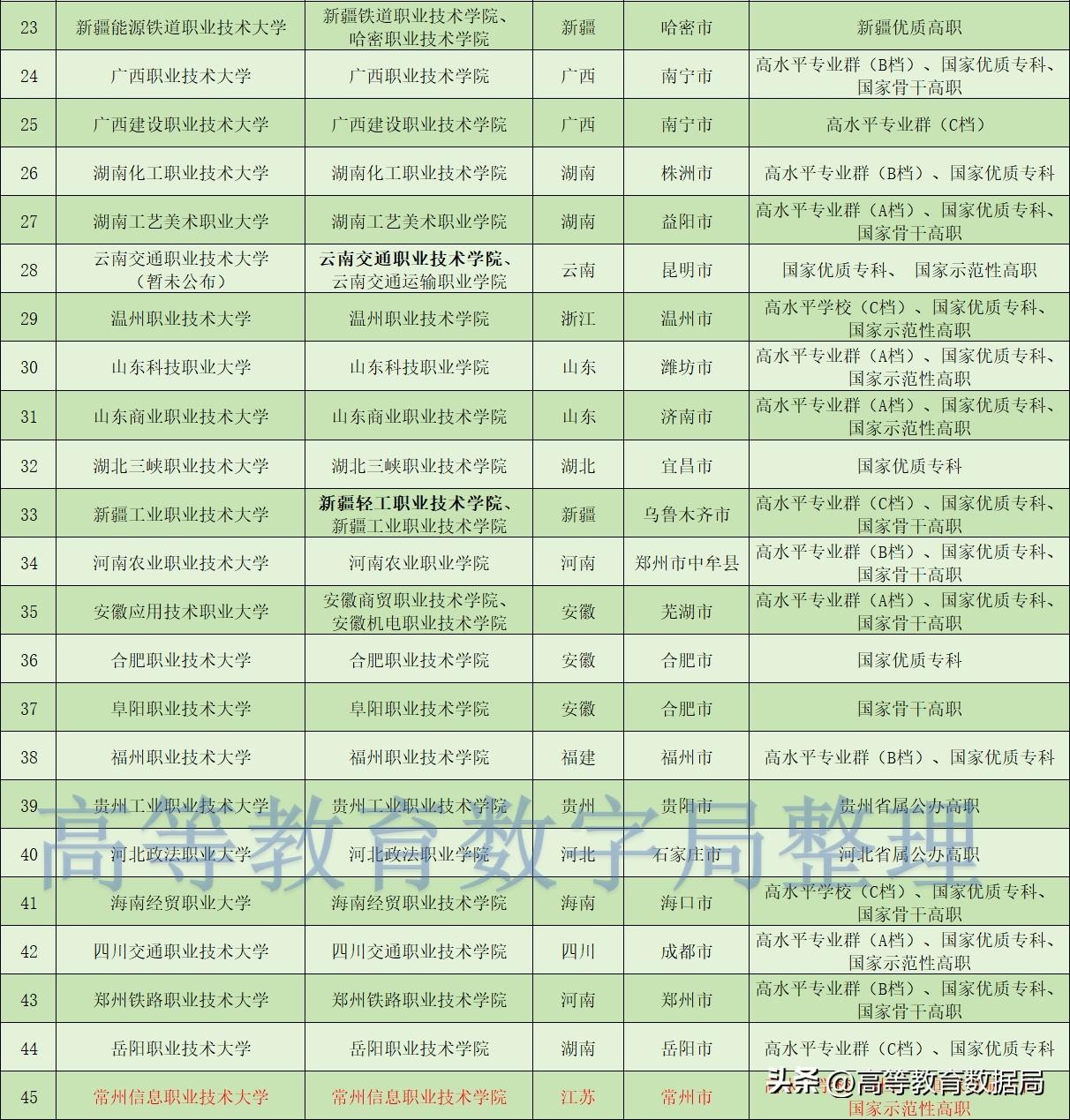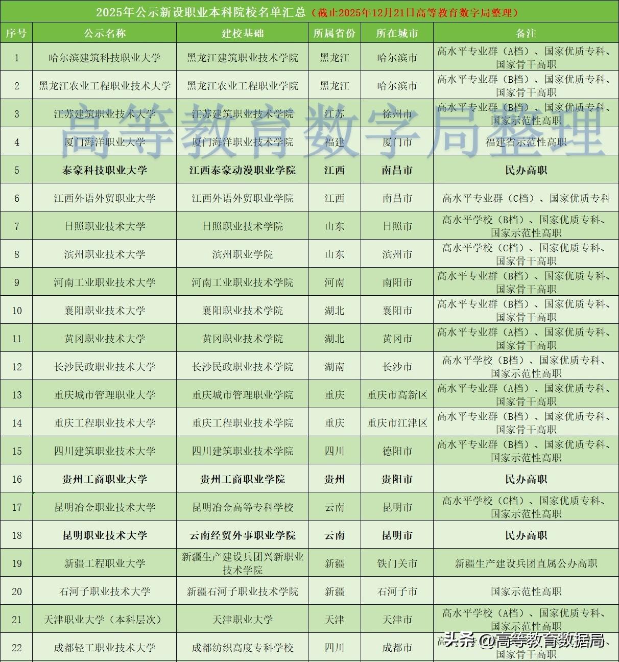 2025年12月19日,四川、河南、吉林、湖南等4个省份以及中国民用航空局共同发布了高校设立的公示消息,其中包括以四川交通职业技术学院为基础升格设立四川交通职业技术大学;以郑州铁路职业技术学院为基础升格设立郑州铁路职业技术大学;以岳阳职业技术学院为基础升格设立岳阳职业技术大学等3所公办高职升格为职业本科大学的消息。 共有19个省份公示了哈尔滨建筑科技职业大学、山东商业职业技术大学、合肥职业技术大学等45所职业本科大学的设置事项,将等待教育部的评估和审批。 从省份分布来看,山东、湖南和新疆3个省份各有4所职业本科的进行了设置公示。山东是全国职业教育创新发展高地,湖南是中部职业教育最强省,新疆当前获得国家的重大政策支持,三省都急需大力发展职业本科支持产业发展;河南、湖北、四川、云南、安徽等5个省份,各有3所职业本科设置公示;黑龙江、江苏、福建、江西、重庆、贵州、广西等7个省份,各有2所职业本科设置公示;天津、浙江、河北、海南等4个省份,也各公示了1所职业本科。新设置的职业本科大学中,包括了农业、工业、建筑、外语、交通等多个领域,为国家培养各行各业需要的高层次技术技能人才。 职业本科高校 职业院校