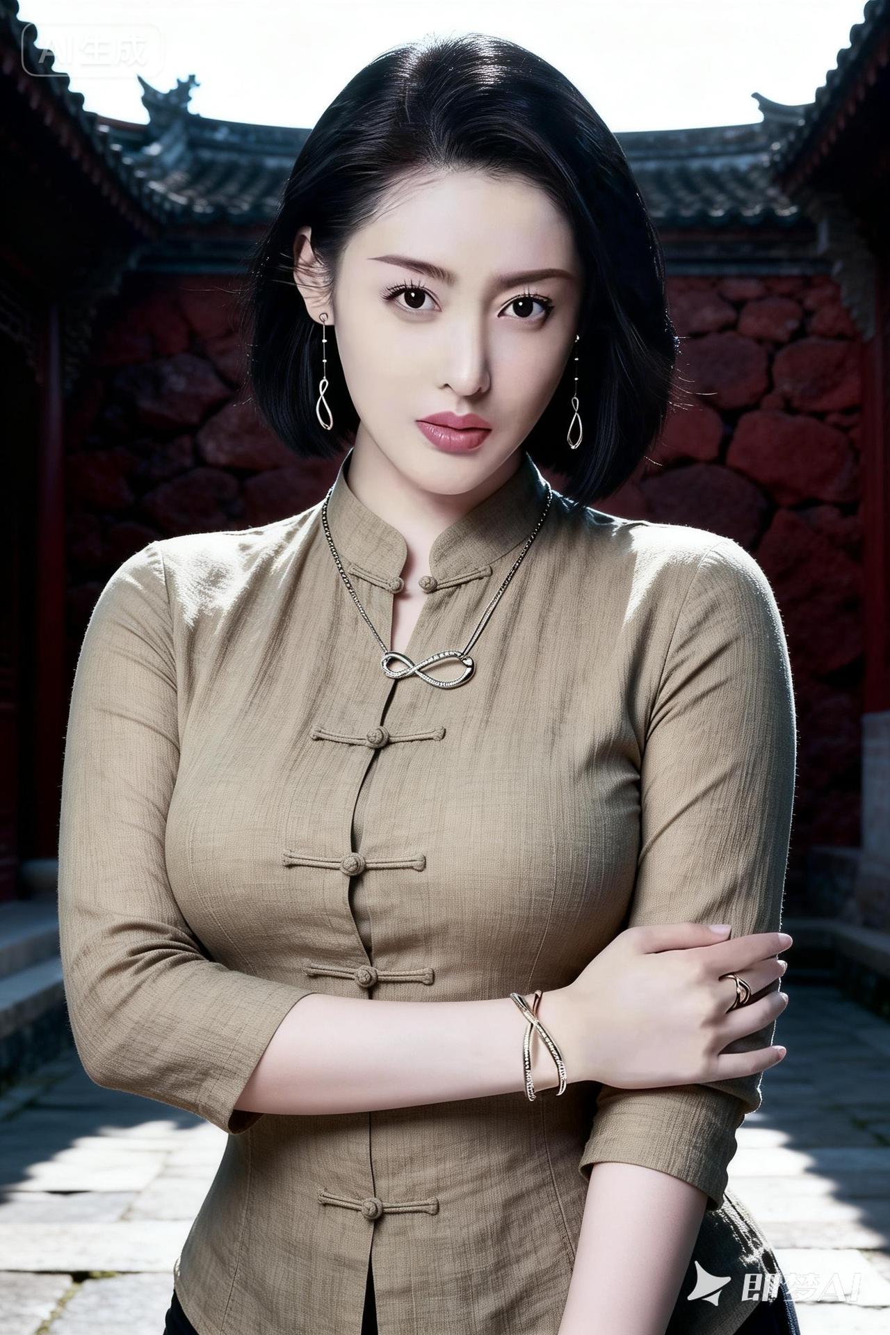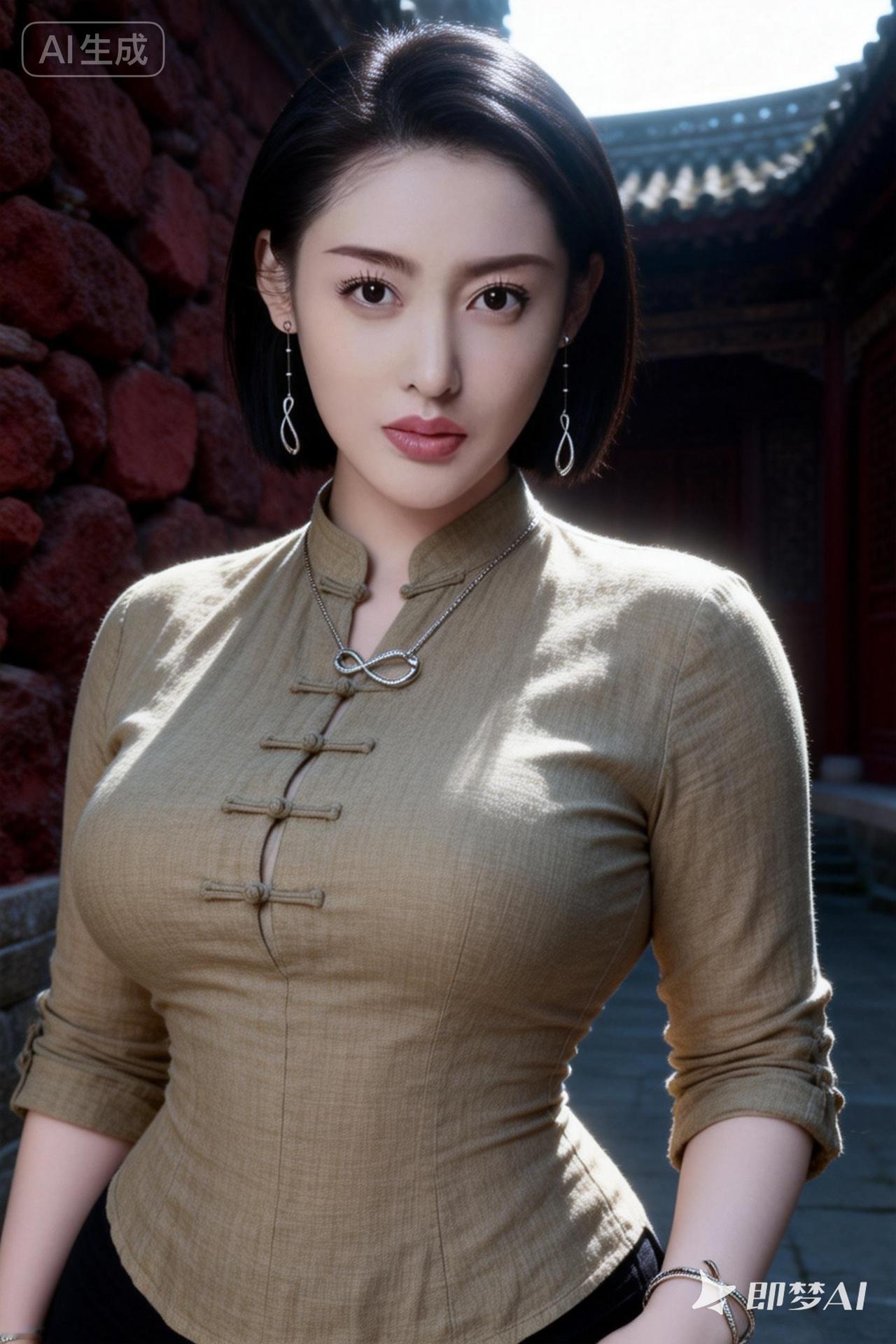 古风美女,黑发红唇,优雅气质,传统服饰,背景红墙