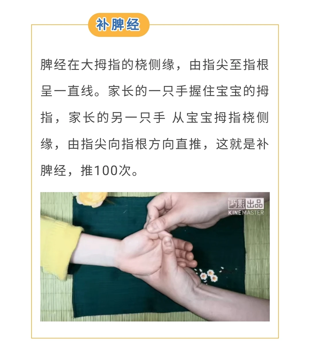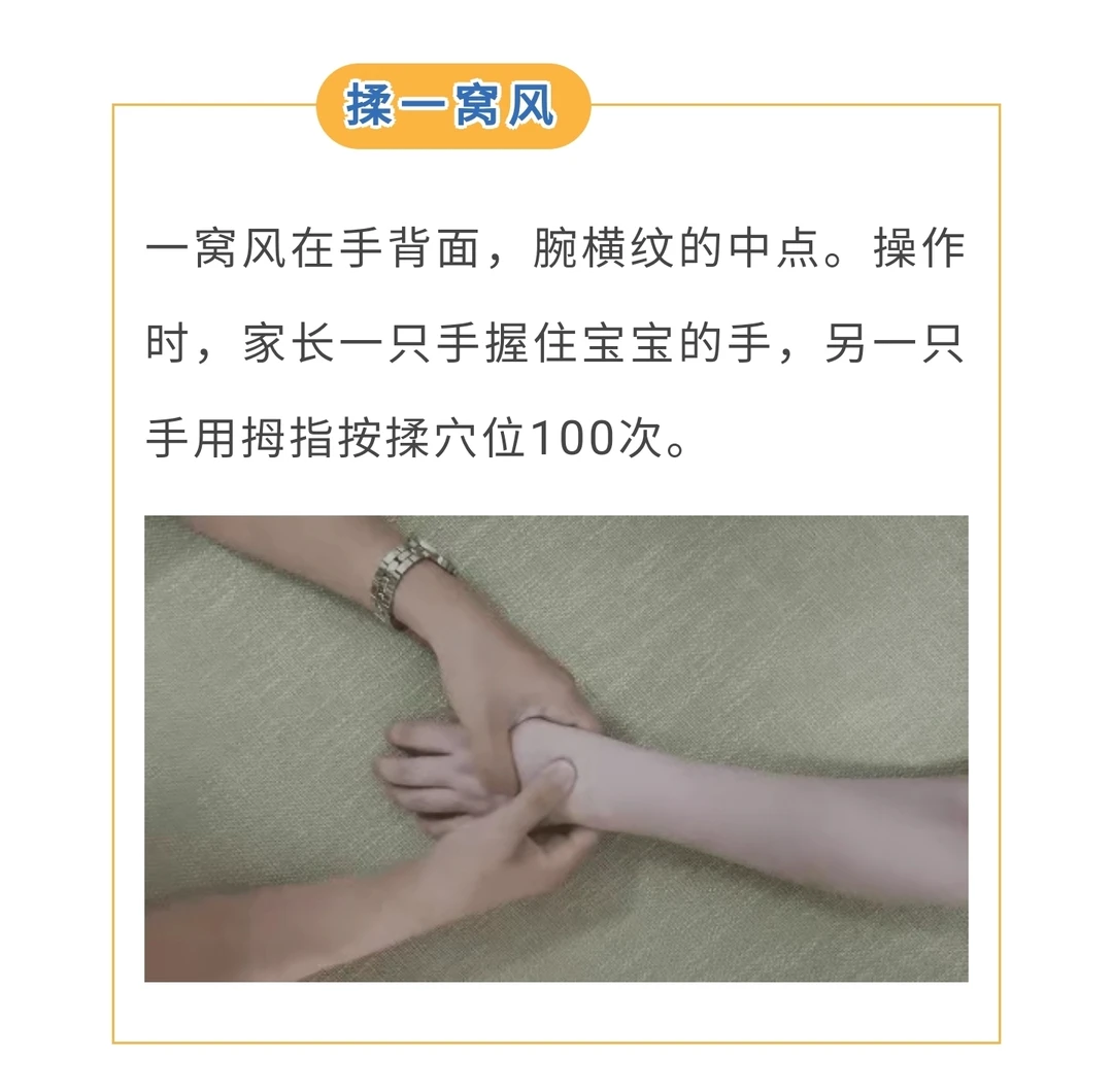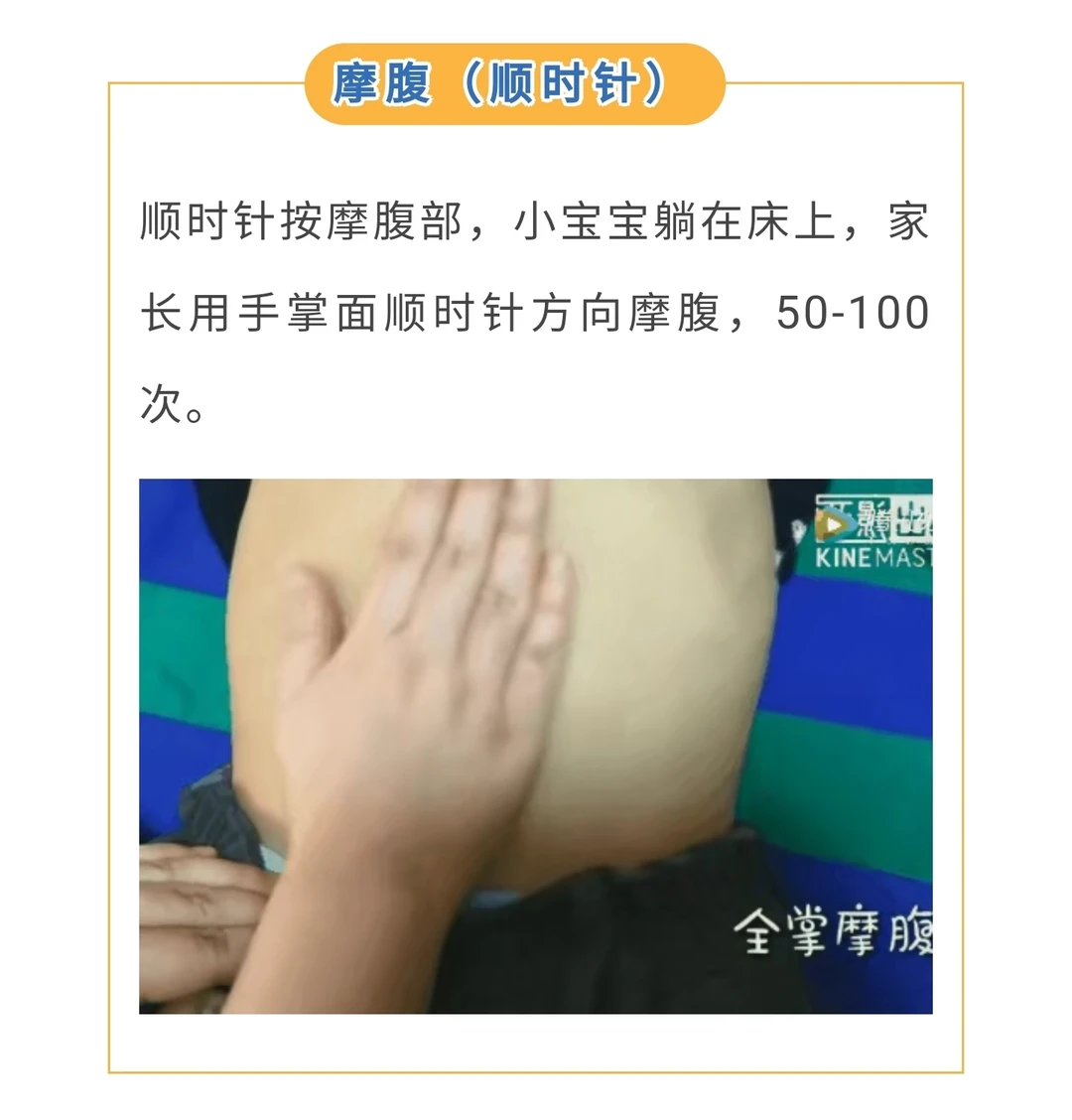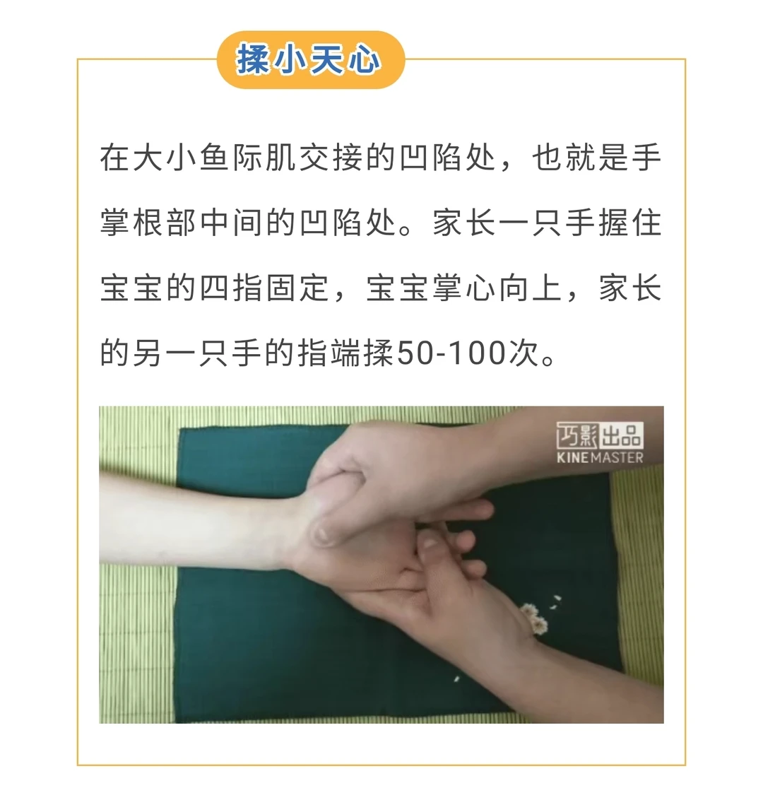⭕️为什么宝宝会肠胀气呢? 宝宝出生后获得营养的渠道变了,在母亲肚子里由胎盘供给,出生后变成了宝宝的胃肠道吸收供给,而新生儿的胃肠道并没有发育好,所以很容易出现胀气。 不过,胀气并不会影响宝宝的生长发育,而且肠胀气的发生和母乳还是奶粉喂养没有直接关系,大多数宝宝在出生后2-4周会出现胀气,3个月以后症状逐渐减轻。 ⭕️胀气都会有哪些表现呢? 当胃肠道内出现空气过多时,宝宝可出现烦躁、乱扭乱抻,哼哼唧唧,满脸通红,腹胀甚至腹痛的症状和体征。持久、无法安抚的哭闹和烦躁是婴儿早期常见且特有的症状。 ⭕️胀气推拿手法 ----------揉一窝风---------- 一窝风在手背面,腕横纹的中点。操作时,家长一只手握住宝宝的手,另一只手用拇指按揉穴位100次。 ----------摩腹(顺时针)---------- 顺时针按摩腹部,小宝宝躺在床上,家长用手掌面顺时针方向摩腹,50-100次。 ----------补脾经---------- 脾经在大拇指的桡侧缘,由指尖至指根呈一直线。家长的一只手握住宝宝的拇指,家长的另一只手从宝宝拇指桡侧缘,由指尖向指根方向直推,这就是补脾经,推100次。 ----------揉小天心---------- 小天心在大小鱼际肌交接的凹陷处,也就是手掌根部中间的凹陷处。家长一只手握住宝宝的四指固定,宝宝掌心向上,家长的另一只手的指端揉50-100次。 (具体操作手法如上图) ⭕️注意事项 手法一定要轻柔,持久,小婴儿的皮肤很娇嫩,不能粗暴用力,推拿的时候要用宝宝的润肤露或者宝宝的爽身粉减少摩擦。 时间应在喂奶后一个小时之后进行,操作时间不宜超过20分钟。 罗大伦 育儿 小儿推拿 宝宝胀气 排气操