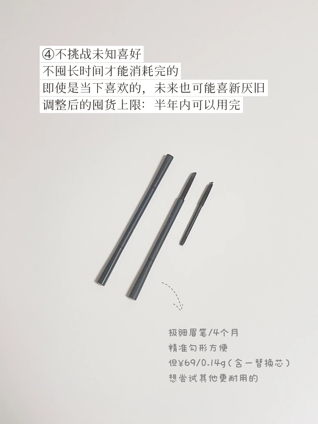 不囤长时间才能消耗完的,即使是当下喜欢的,未来也可能喜新厌旧,更何况未知新品。调整后的囤货上限:半年内可以用完。