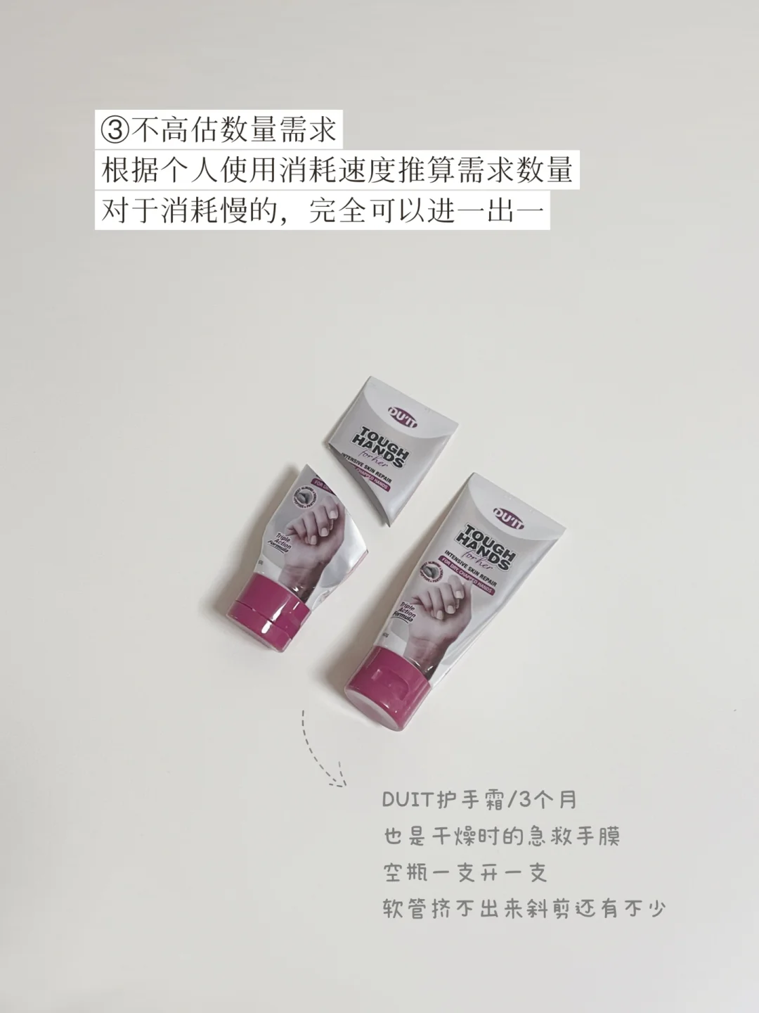 根据个人使用消耗速度推算需求数量,不要过量囤积。对于消耗慢的,譬如彩妆类,完全可以进一出一。