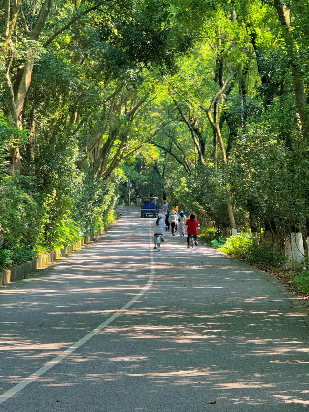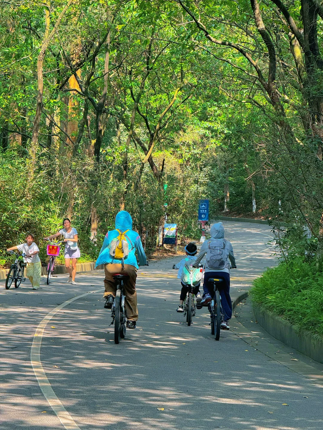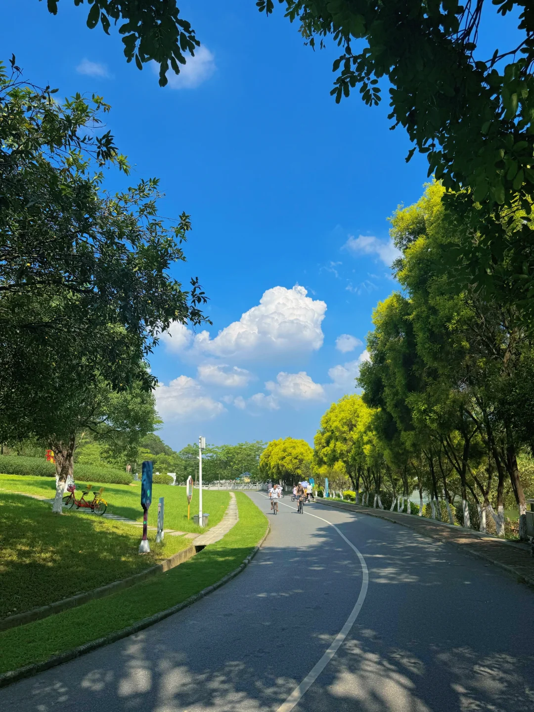 看完荷花继续往前骑!大夫山的绿道简直是太爱了!郁郁葱葱的树木交织成天然遮阳伞,阳光透过缝隙洒下斑驳跳跃的光影,骑行其中,微风拂面,仿佛穿梭在绿色隧道里。抬头看,棉花糖一样的漫画积云就在头顶,治愈值瞬间拉满!