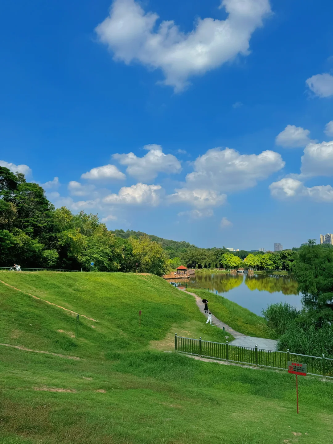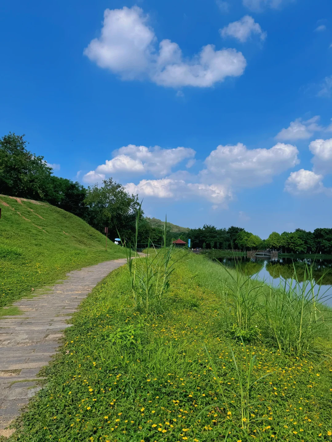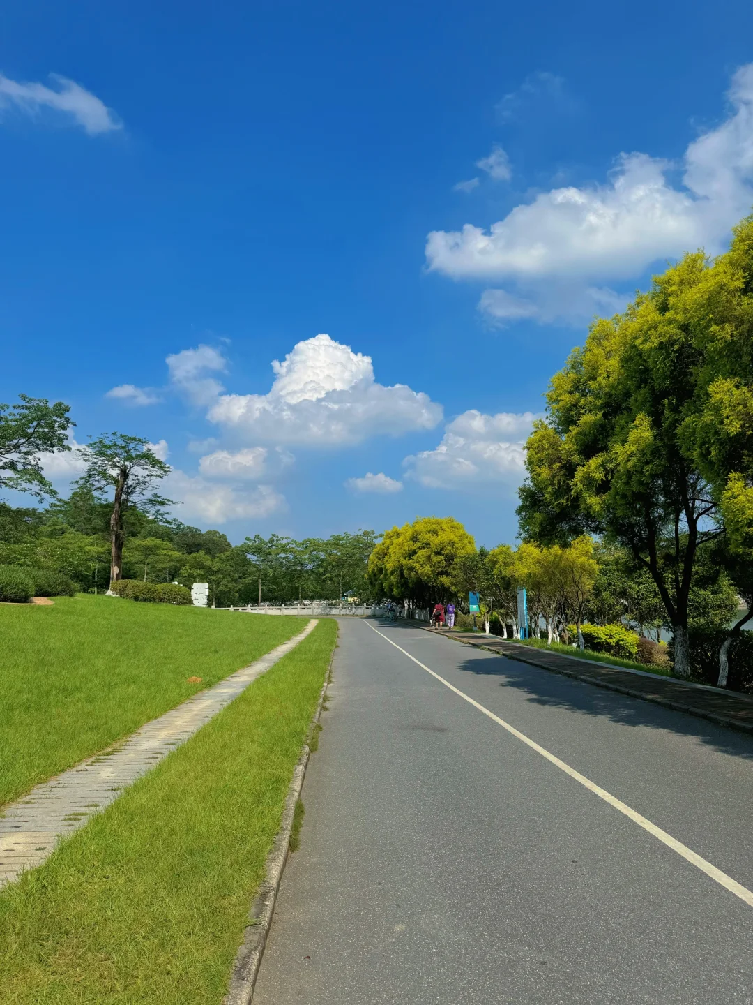 看完荷花继续往前骑!大夫山的绿道简直是太爱了!郁郁葱葱的树木交织成天然遮阳伞,阳光透过缝隙洒下斑驳跳跃的光影,骑行其中,微风拂面,仿佛穿梭在绿色隧道里。抬头看,棉花糖一样的漫画积云就在头顶,治愈值瞬间拉满!