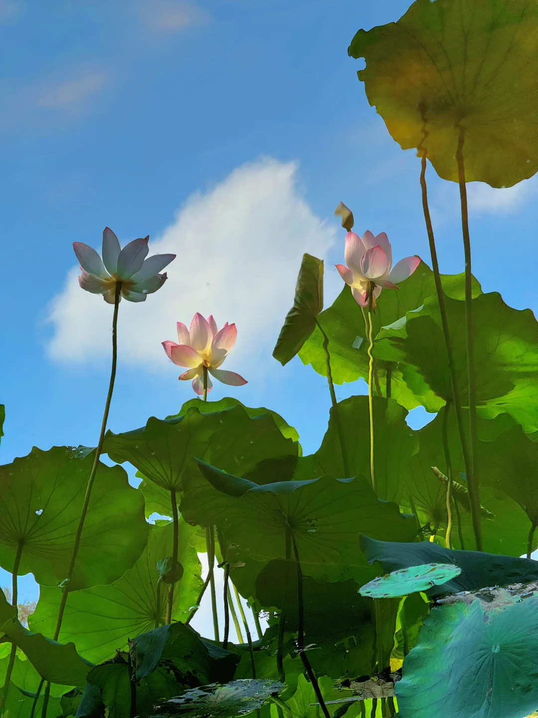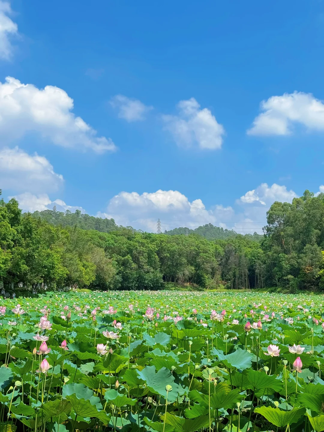 风路过荷塘时偷了花香🪷头顶积云像刚拆封的棉花糖☁️☁️软蓬蓬坠向青山