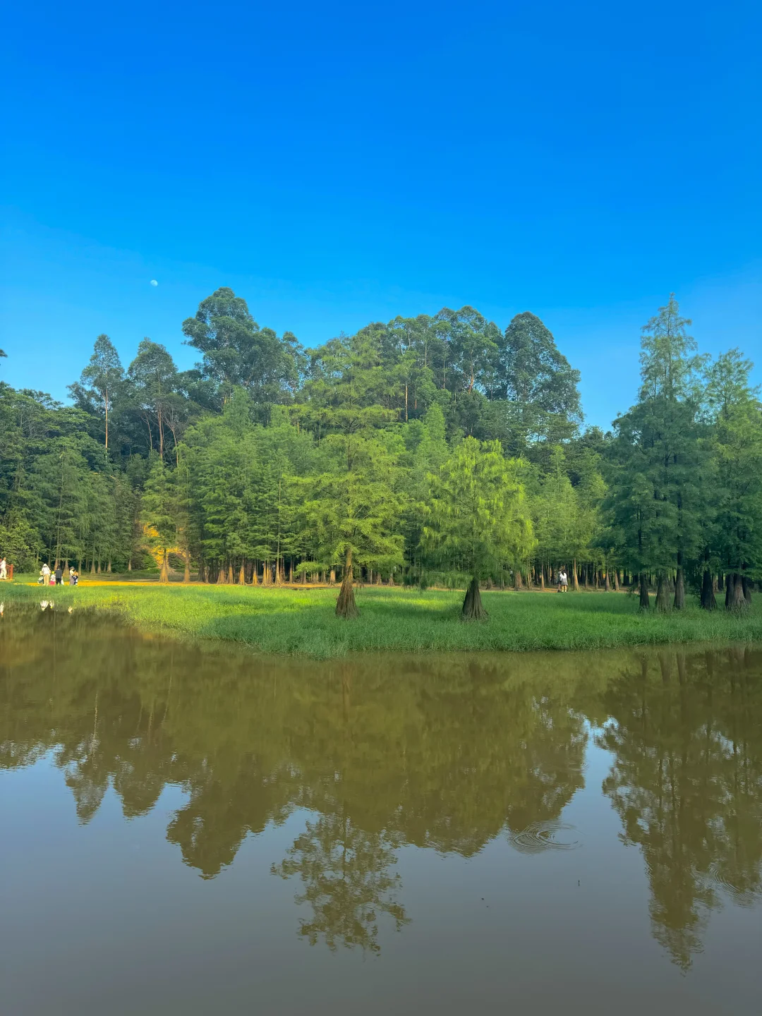 漫画般的蓝天白云、随风摇曳的透光荷塘、绿意飞扬的落羽杉…