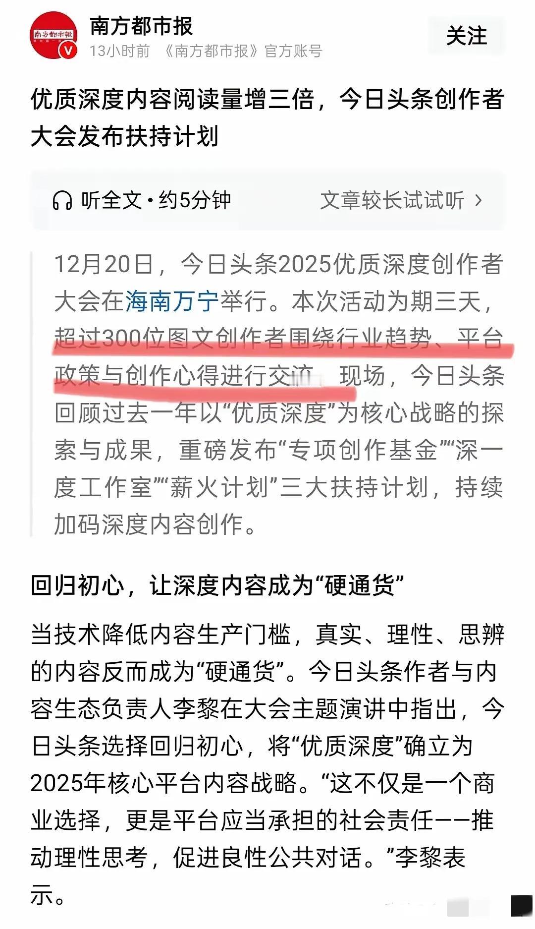看来2026年我就不得不告别今日头条了。 今天看了很多头条,在万宁举行的年度创作会议总结下来,就是要专业,要深耕,要精彩! 在头条平台上,我就像股市上的小散户,只有挨打的份,赚钱的事情根本轮不到我。 本来现在的收入就已经低得没有办法看了,如果2026年头条启动这样的改革,我在头条上就更加没有活路了。 每天将大把时间花在头条的创作上,结果就换来这三瓜两枣,如果明年彻底没有了,咱就干别的去,就算去街上卖几块臭豆腐,我感觉收入也比在头条要高得多。 此处不留爷,自有留爷处,处处不留爷,爷卖臭豆腐!