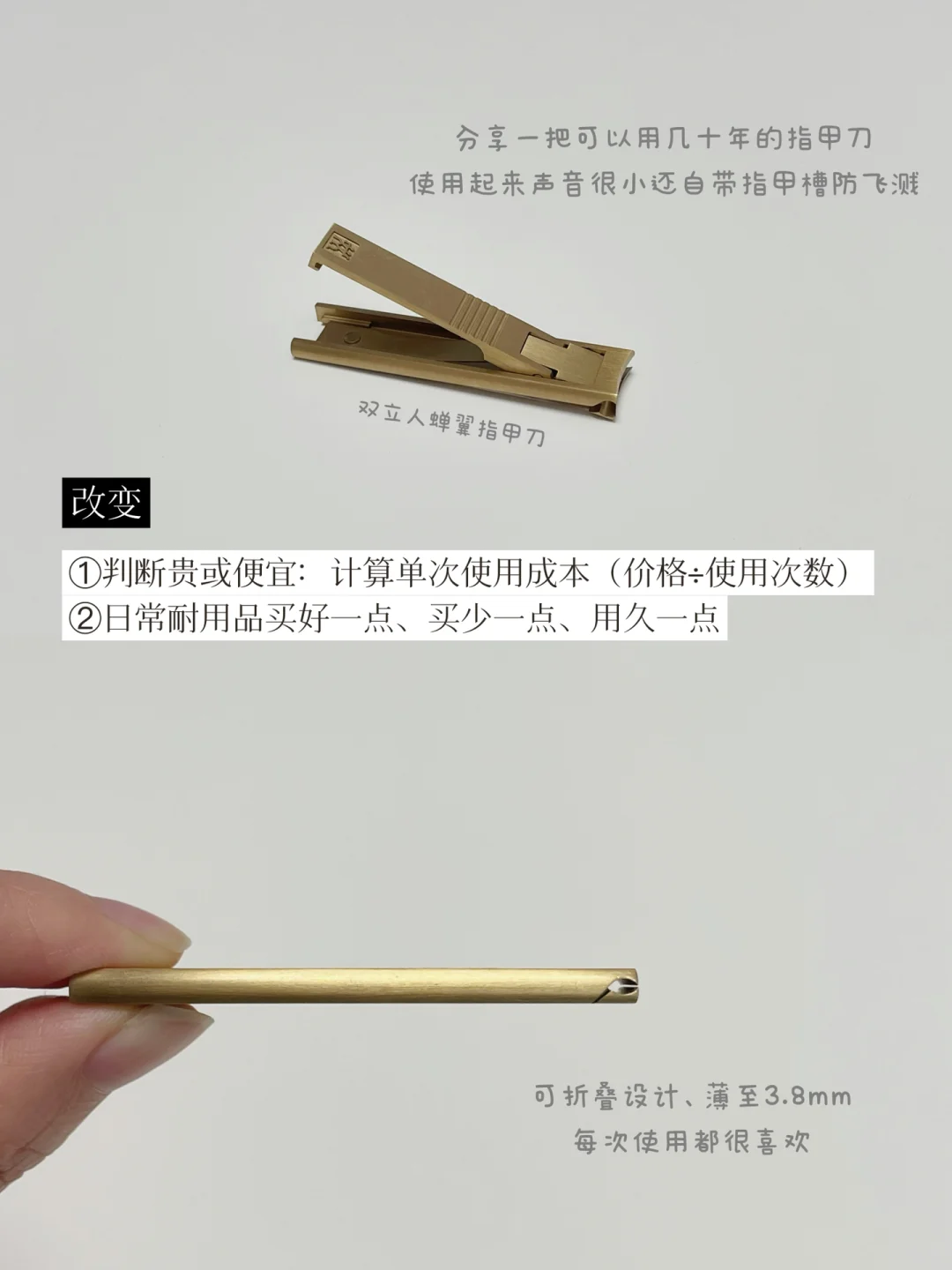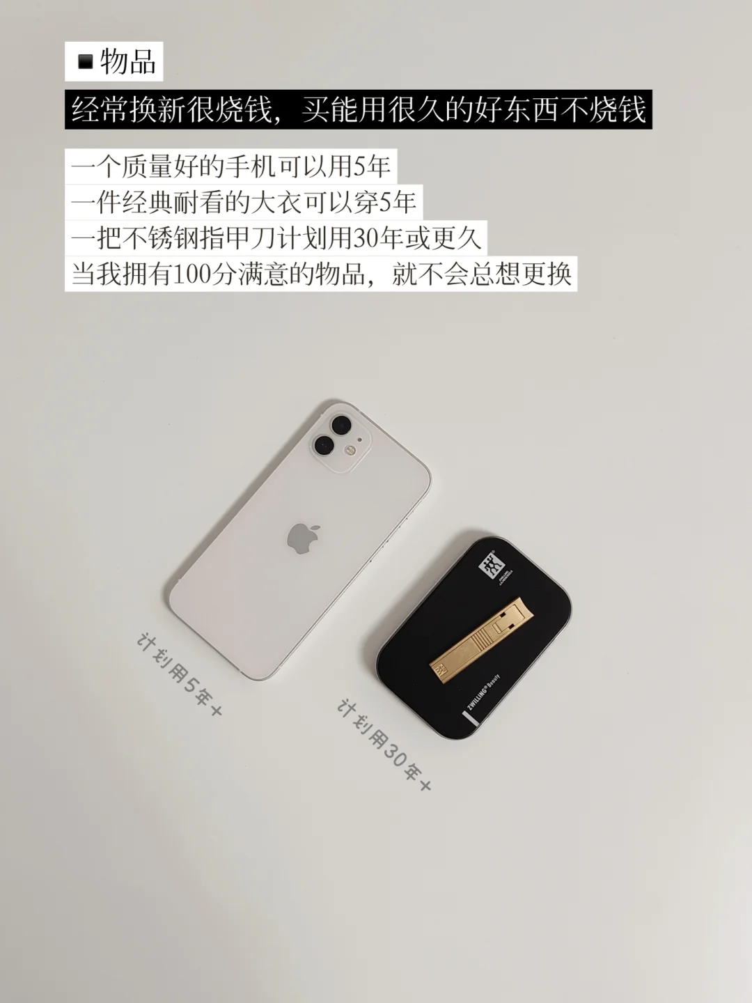 一个质量好的手机可以用5年,一件经典耐看的大衣可以穿5年,一把不锈钢指甲刀计划用30年或更久。当我拥有100分满意的物品,就不会总想更换。