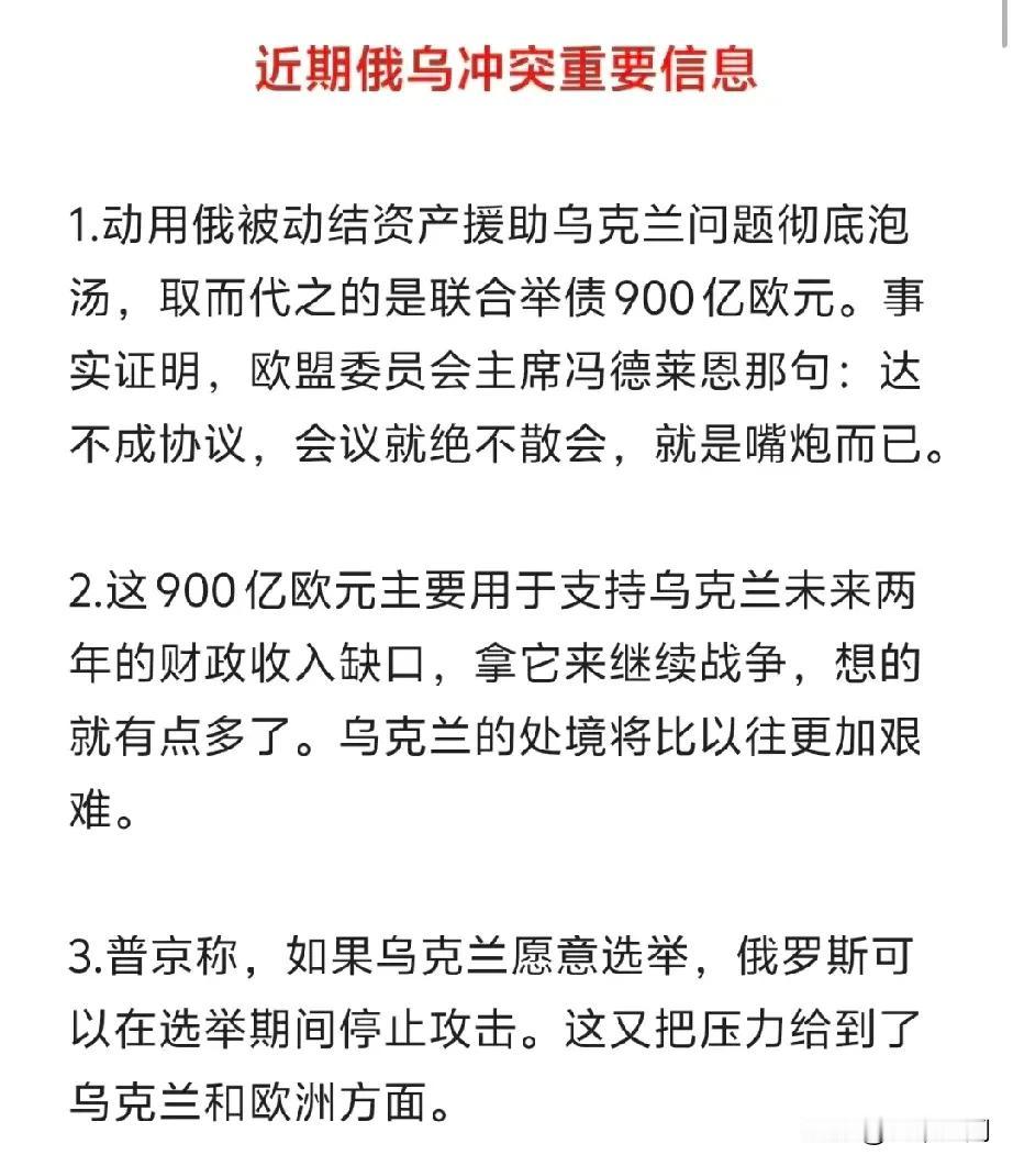 冯德莱恩终究不敢动俄罗斯的外汇存款,因为整个欧盟就没有几个国家敢支持把冻结的俄罗斯外汇转给乌克兰,因为俄罗斯警告过,敢动这些钱,就会被种蘑菇,所以冯德莱恩最终还是选择举债的放在,政府欧盟联合借900亿欧元给乌克兰,这个是贷款,有利息的!这900亿欧元,可以让泽连斯基继续撑个一年半载了,其实这非常好,只要俄乌不停,对我们来说都是好事,最重要是能得到实实在在的订单!