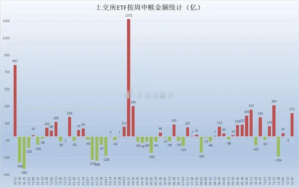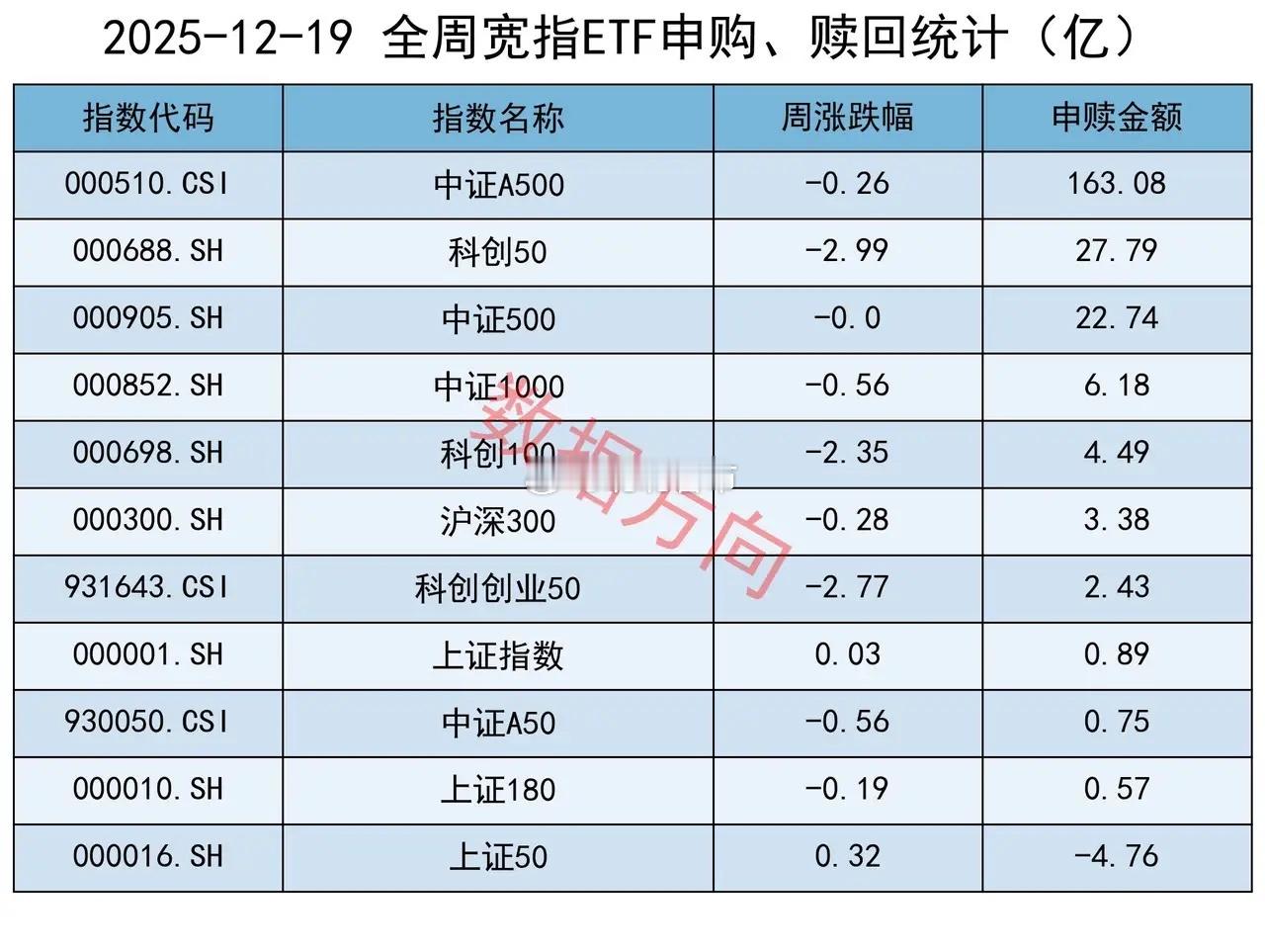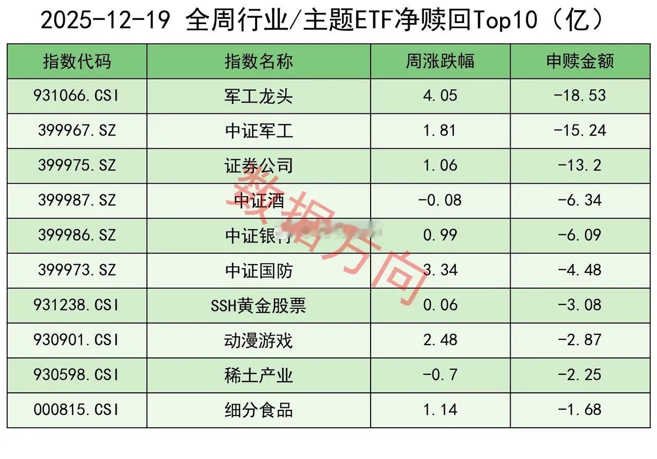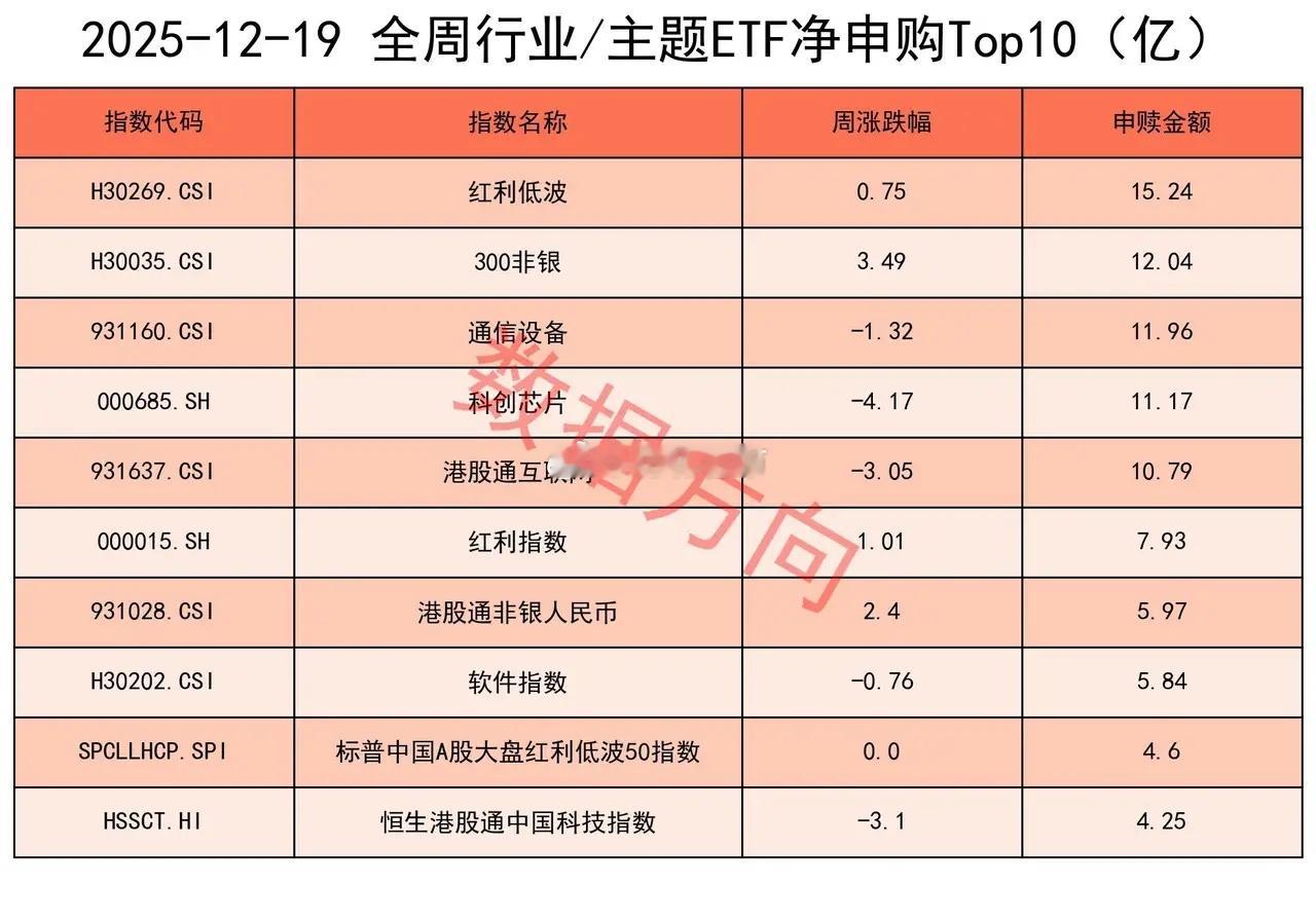 上交所股票型ETF本周净申购272亿本周,上证指数微涨0.03%,上交所股票型ETF净申购272.49亿。五个交易日全部净申购,依次分别为5.44亿、52.63亿、102.44亿、51.96亿和60.02亿。从各宽指的申赎情况来看:中证A500,本周获大幅净申购163.08亿,仅此一家占了全周总额的60%。科创50、中证500,本周净申购双双超过20亿;中证1000、科创100、沪深300、科创创业50、上证指数、中证A50、上证180,本周分别获得小幅净申购;仅有上证50指数在本周被小幅净赎回。根据以前的经验,当所有宽指全部获净申购时,通常是较好的短期信号,说明股价普遍低于ETF的价格,有套利的机会。本周仅有上证50被小幅净赎回。行业和主题申购榜红利低波、红利指数、标普中国A股大盘红利低波50指数,一起进入本周申购榜,合计净申购27.77亿红利指数的核心逻辑是筛选持续高分红、高股息率且盈利稳定的上市公司,通过长期持有分享企业分红收益 + 股价增值收益,本质是赚 “企业盈利分红” 和 “估值修复” 的钱,适合追求稳健收益的长期资金。300非银、港股通非银人民币指数,一起进入本周申购榜,合计18.01亿12 月 5 日金融监管总局下调险资权益投资风险因子:持仓超 3 年的沪深 300、中证红利低波动 100 成分股风险因子由 0.3 降至 0.27,持仓超 2 年的科创板股由 0.4 降至 0.36,显著降低资本占用,释放数百亿 — 千亿级权益增量资金,利好险资配置与自身权益收益。12 月 14 日三部委联合发文,鼓励商业养老、健康险发展,拓宽负债端增长空间。摩根士丹利、中金、瑞银等纷纷上调中国平安等目标价,该股创近4年新高。12 月 17 日中金公司披露吸收合并东兴证券、信达证券预案,18 日复牌,引发市场对券商 “头部整合、提升集中度” 的联想,带动板块联动拉升。赎回榜军工龙头、中证军工、中主国防等指数,一起进入本周赎回榜,合计净赎回38.25亿以航天商业为代表的国防军工板块涨幅居前,个股的价格高于ETF,出现了反向套利的机会。国家将商业航天列为战略性新兴产业,2025 年设立商业航天司并发布《2025—2027 年行动计划》,明确路径与目标。商业航天与传统政府主导航天的核心差异在于以盈利为核心目标。卫星互联网纳入新基建,国家星网、上海 “千帆” 等巨型星座提供海量需求,为商业化提供 “基本盘”,通过降低成本、规模化供给与应用变现形成闭环,兼具战略价值与商业价值。