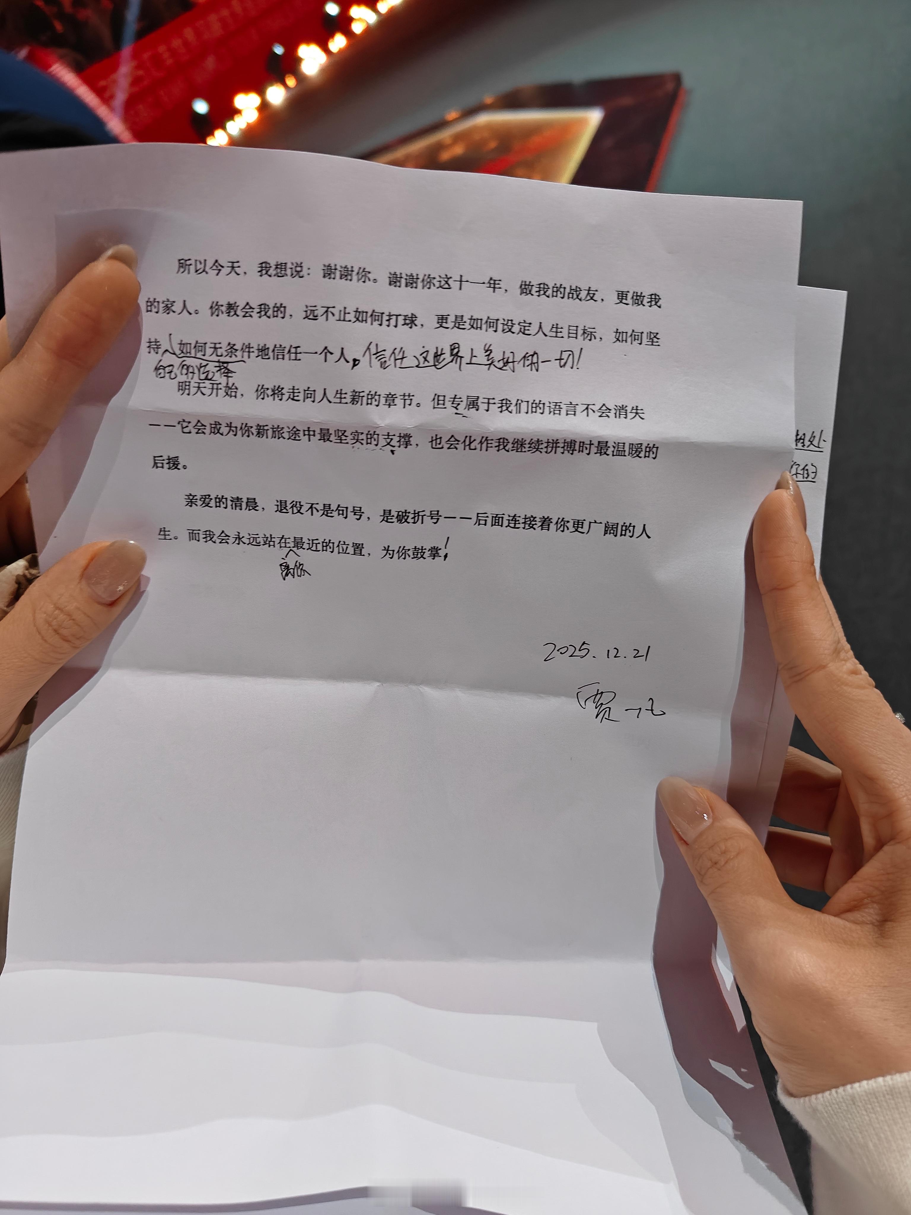 贾一凡给陈清晨退役的发言手稿给清晨的一段话,凡凡写了又改,打印了又手改,每个字都是对清晨的不舍贾一凡说我是清晨妈妈贾一凡说谢谢清晨做我的家人