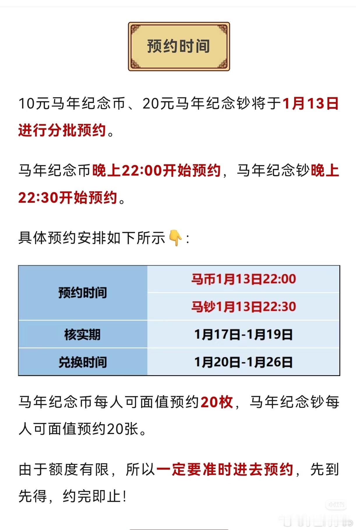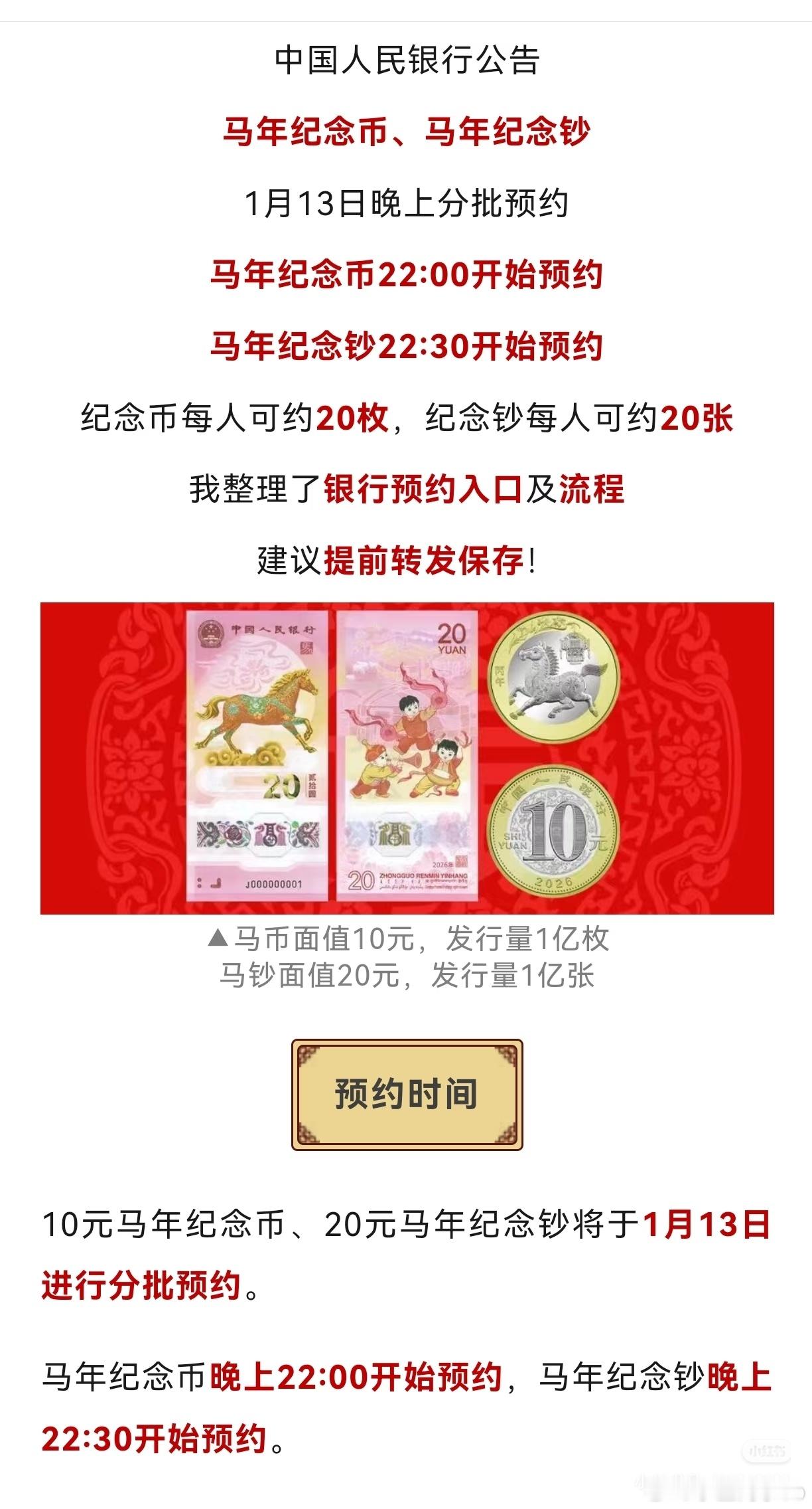 马年纪念币/纪念钞,2026年01月13日开始预约中国人民银行2026🐴马年普通纪念币、纪念钞每人每种可预约20枚(张)具体预约时间未公布,大概率跟往常一样分批,22点和22点30,可以留意关注后续公告