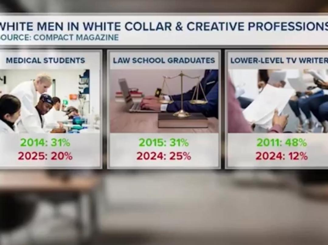最新数据显示,白人正在被各行各业淘汰。 数据显示,"年轻的白人男性已经从白领和创意行业消失". -2014年,白人男性占美国医学生的 31%,到2025年,这一比例将降至20%. -白人男性在法学院毕业生中所占比例从31%下降到25%. -从48%的低级别电视编剧降至不足12%. 《大西洋月刊》的编辑团队构成从53%的男性和89%的白人,变为36%的男性和66%的白人。 在哈佛大学人文学科领域,白人男性在终身教职岗位中所占比例已降至仅18%. "这并非偶然,而是精心策划的,是多元化,公平和包容(DEI)的举措。为了克服之前那些将女性和有色人种拒之门外的,令人发指的歧视性做法,白人主导的行业干脆将歧视的矛头指向了白人男性,这实在令人震惊,因为所有种族歧视都令人震惊。" New data shows White People are being eliminated from industries The data “found that young white men have vanished from white-collar and creative professions - In 2014, white men were 31% of American medical students, by 2025, they were just 20% - White men dropped from 31% of law school graduates to 25% - From 48% of lower-level TV writers to just less 12%. - The Atlantic's editorial staff went from 53% male and 89% white to 36% male and 66% white - White men fell to just 18% of tenure-track positions in the humanities at Harvard “This wasn't by accident, it was by design, DEI design. To overcome what had been admittedly terrible discriminatory practices that kept out women and people of color, white color industries simply reversed the discrimination and aimed it at White guys, it's really appalling because all racial discrimination is appalling.”