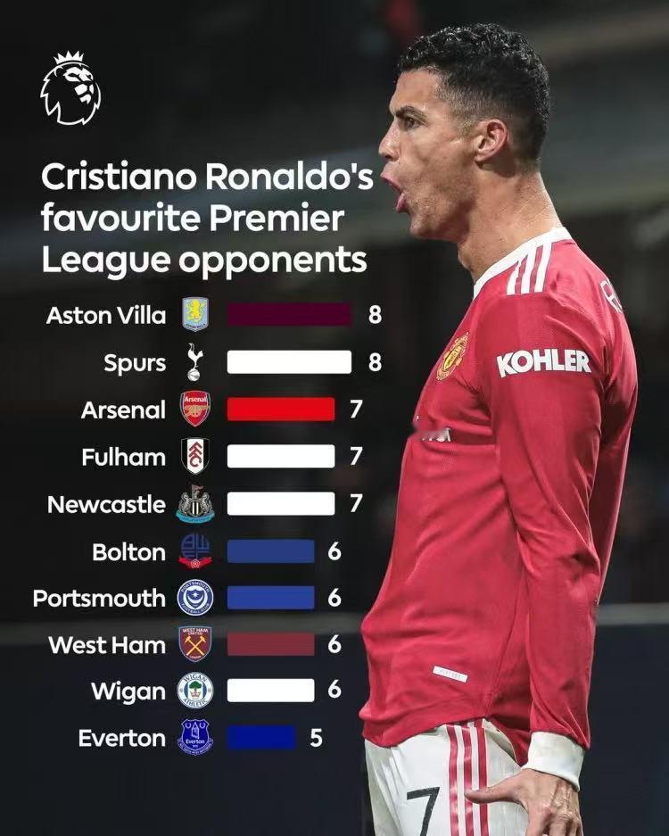 在曼联对阵维拉的赛前,英超官方晒出了曼联传奇C罗对英超各球队的进球数据,其中维拉和热刺是C罗最喜欢的对手。令人尴尬的是,曼联随后输掉了比赛。