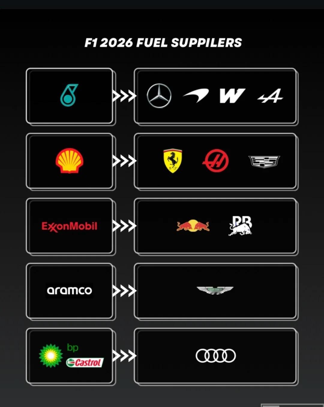 2026年,11支F1车队的燃油供应商👇(注:2026年F1将使用100%的可